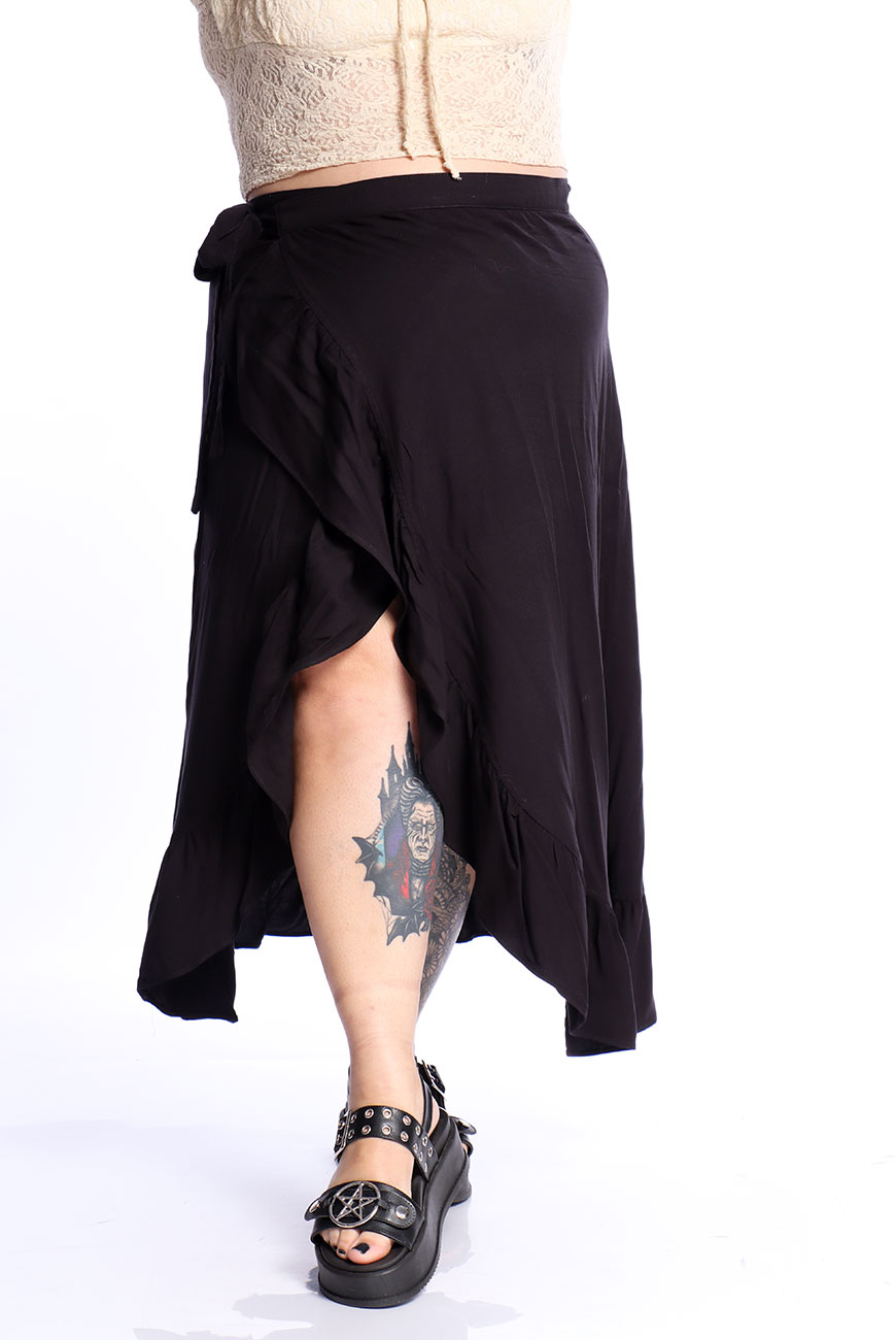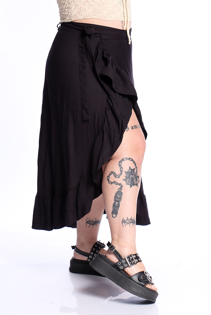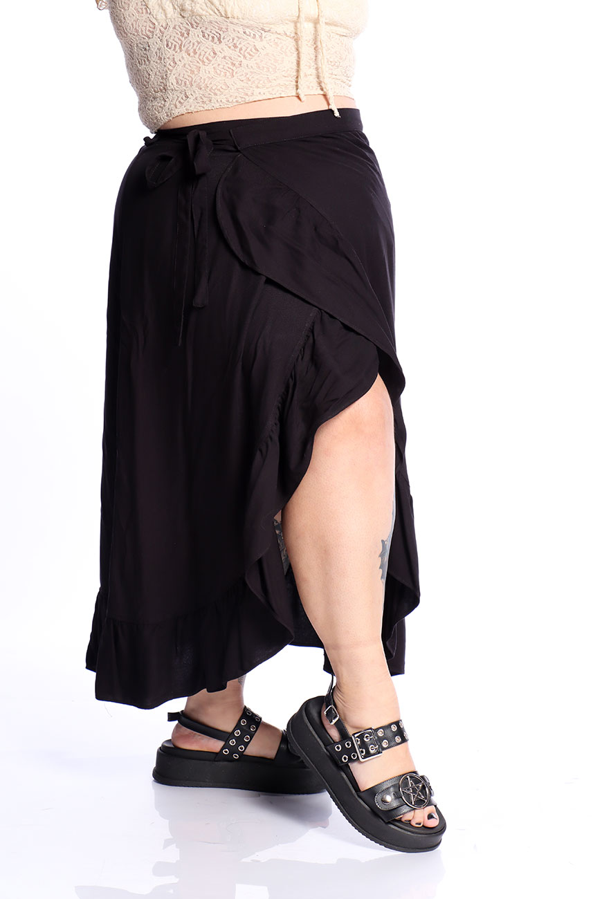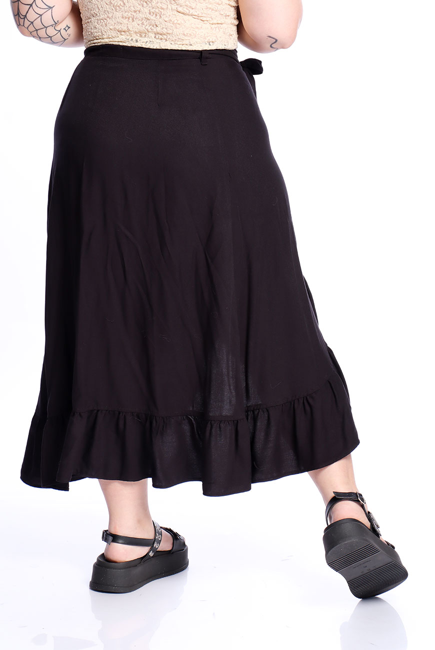 Produzida em viscose super macia e leve, a Saia Envelope Preta Shadow Dancer é uma peça versátil e ideal para usar em dias quentes.
