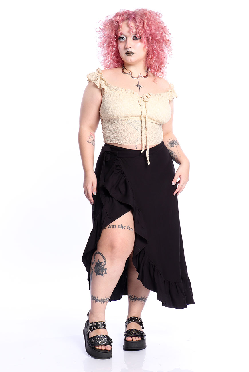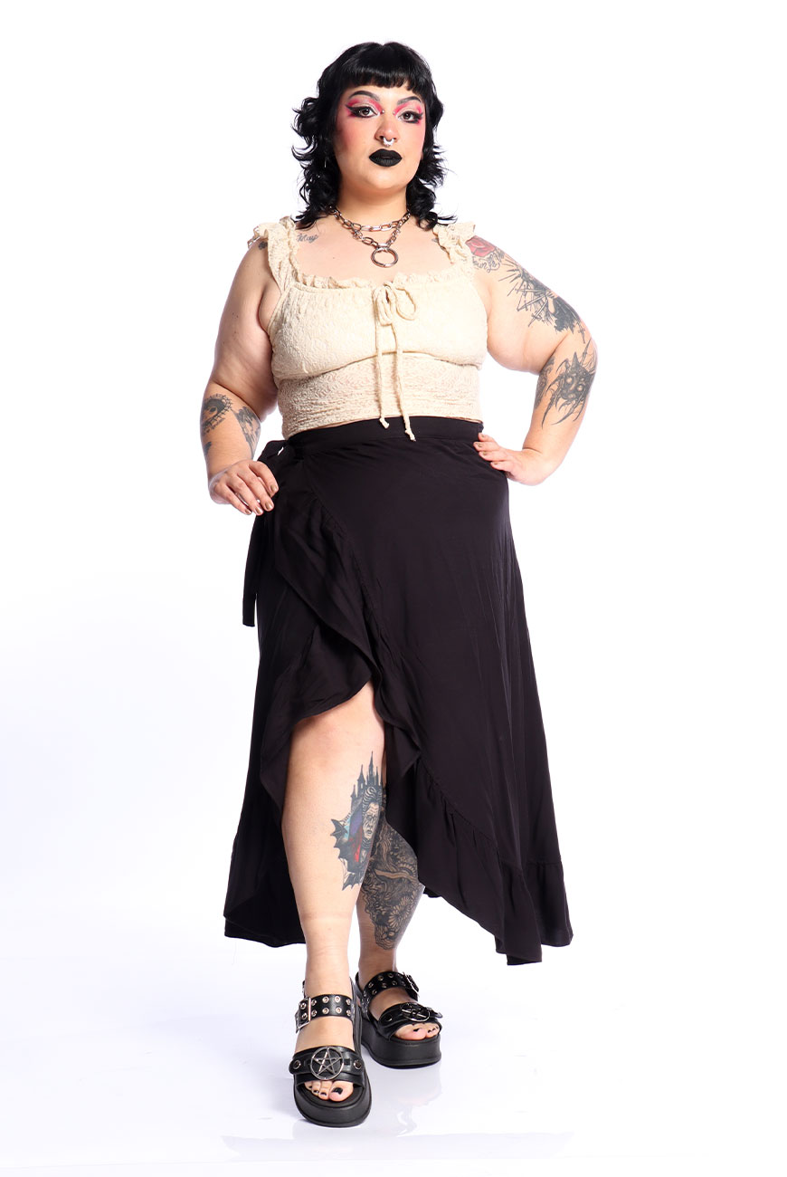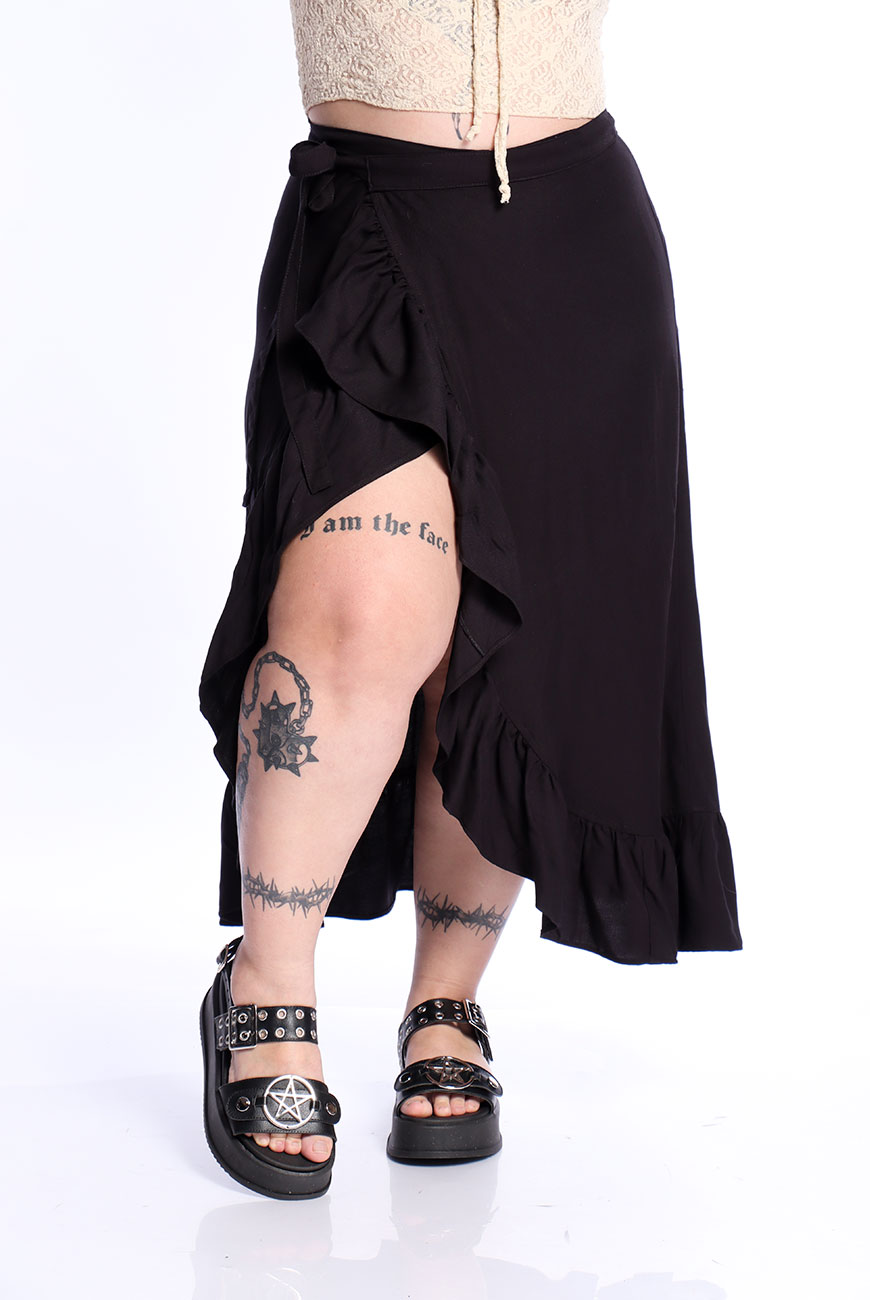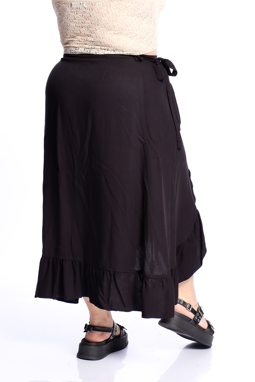 Produzida em viscose super macia e leve, a Saia Envelope Preta Shadow Dancer é uma peça versátil e ideal para usar em dias quentes.