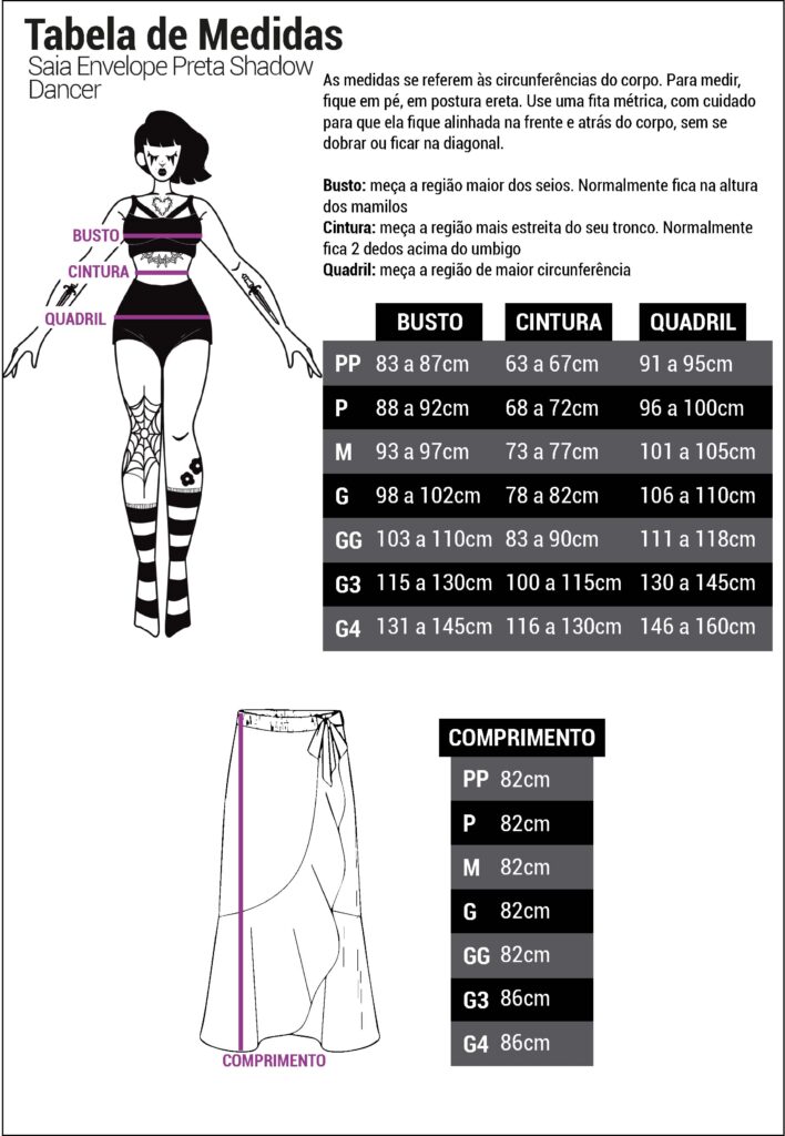 Modelo tamanho M: Altura: 1,55m/ Cintura: 77cm/ Busto: 96cm/ Quadril: 110cm.