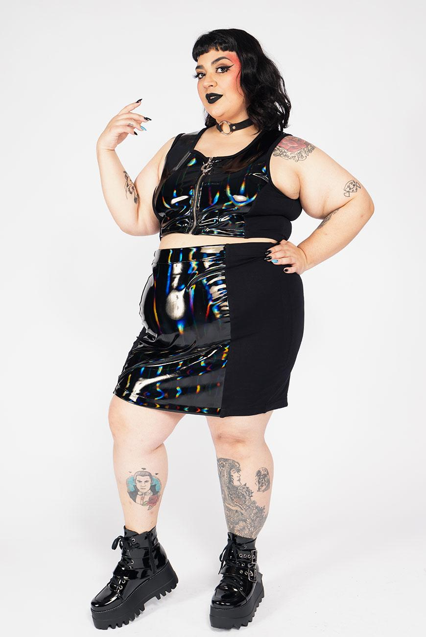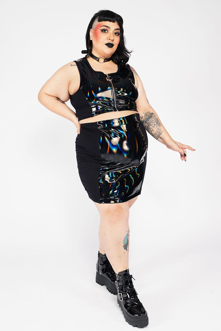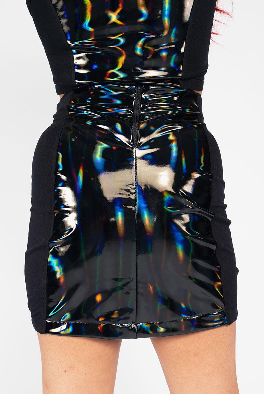 Saia justa, com recorte frontal e traseiro em vinil holográfico e laterais em moletinho super macio, para maior vestibilidade e conforto. Tem abertura por zíper na parte de trás.
