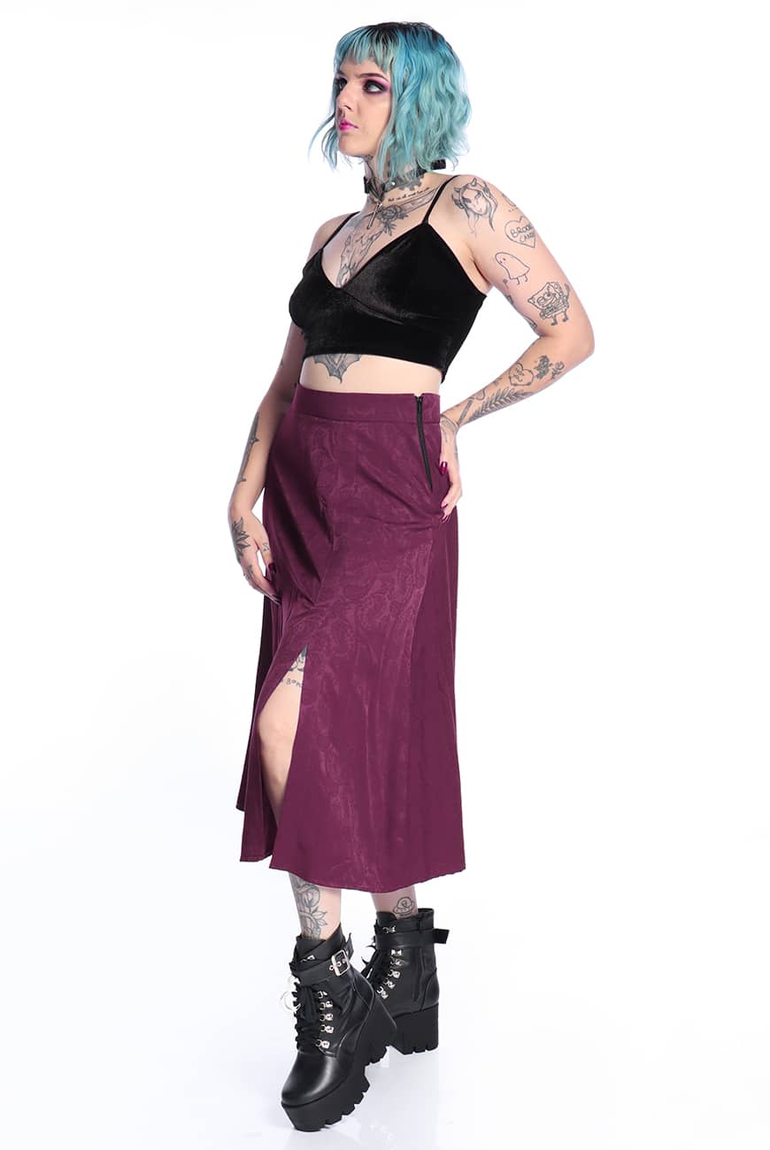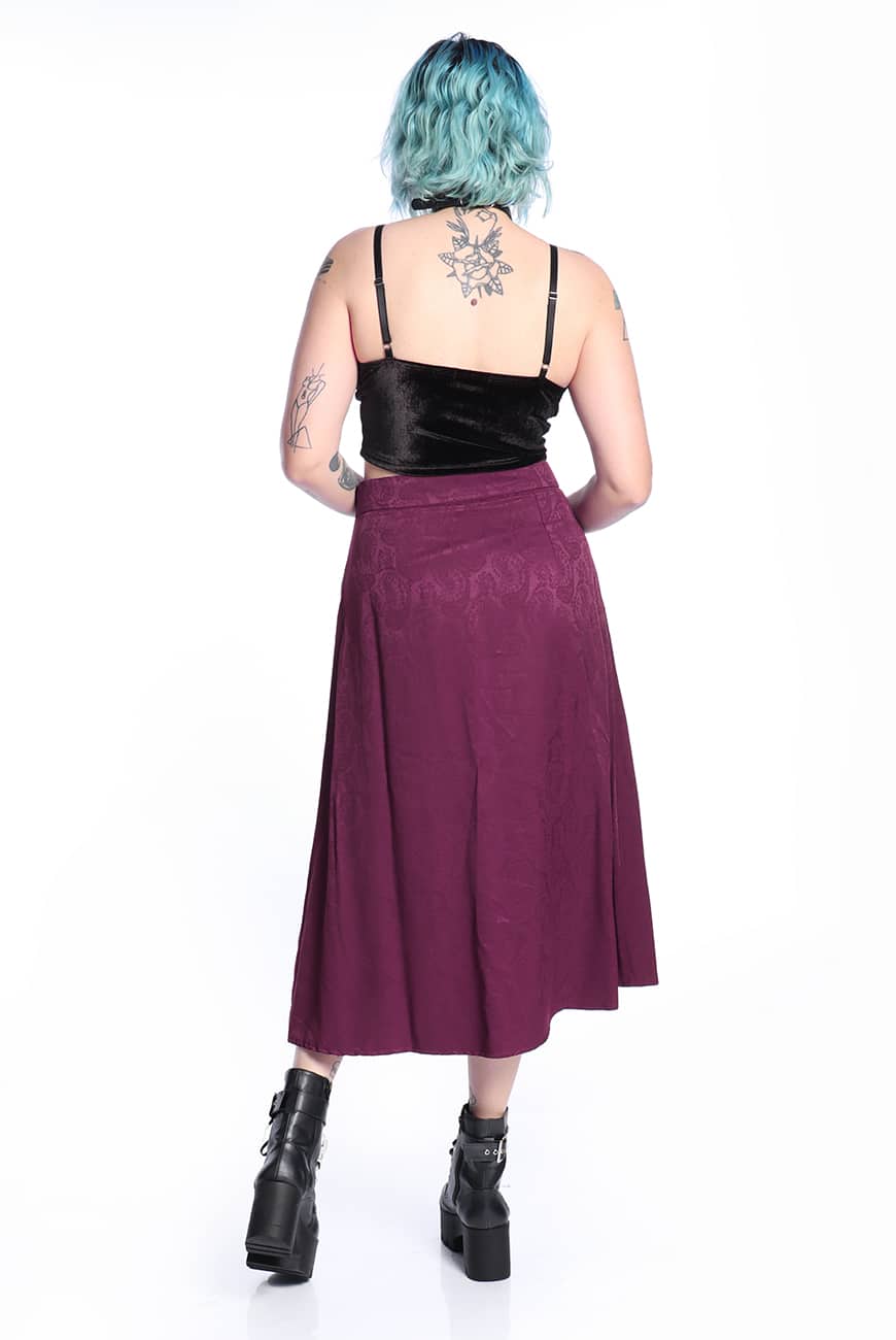 A Saia Midi Arabesque Roxa é produzida em tecido de viscose leve, num tom de roxo incrível com estampa de arabescos e brilho levemente acetinado.