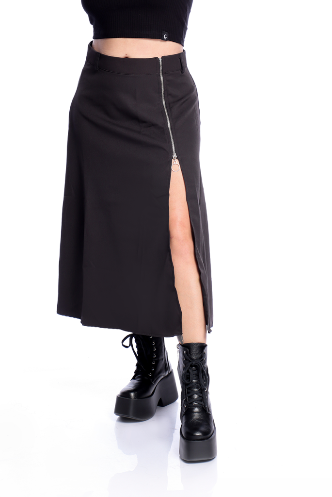 Com uma fenda lateral impactante, seu fechamento é feito atráves do zíper de metal com um puxador incrível de argola niquelada, trazendo mais peso para a peça. Possui passantes no cós para poder ser estilizada com cintos ou correntes.