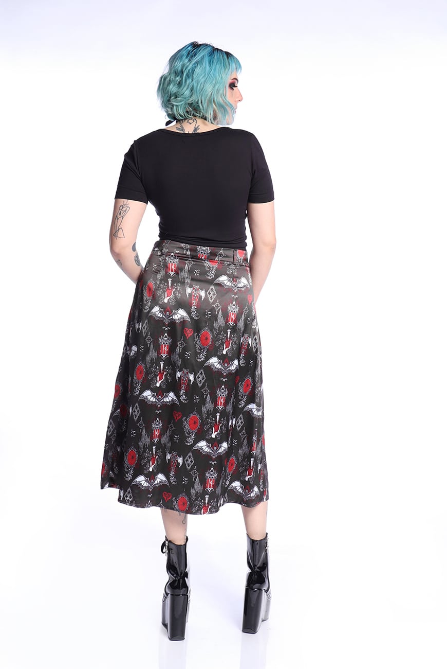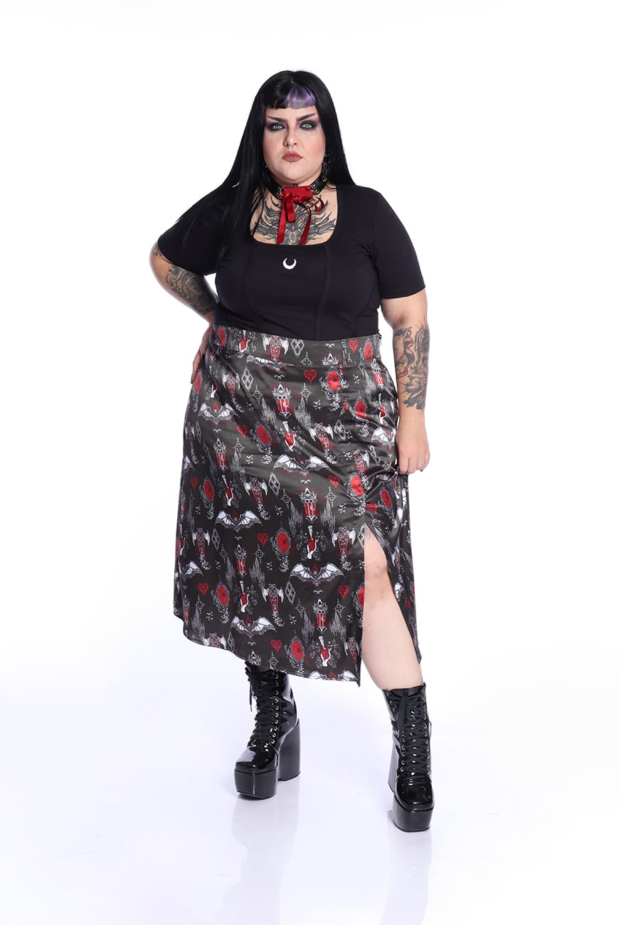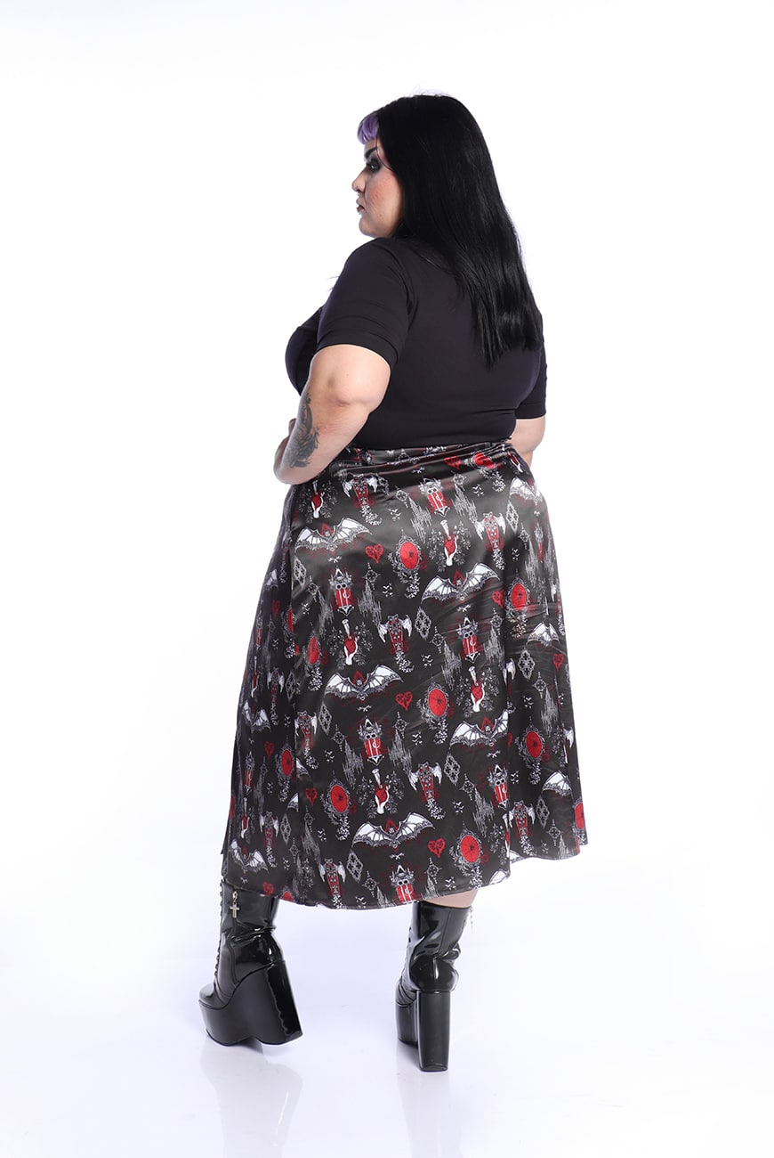 A Saia Midi Dracul tem modelagem evasê, comprimento midi e foi produzida em um cetim com toque macio e brilho sofisticado, estampado com arte exclusiva da Reversa!