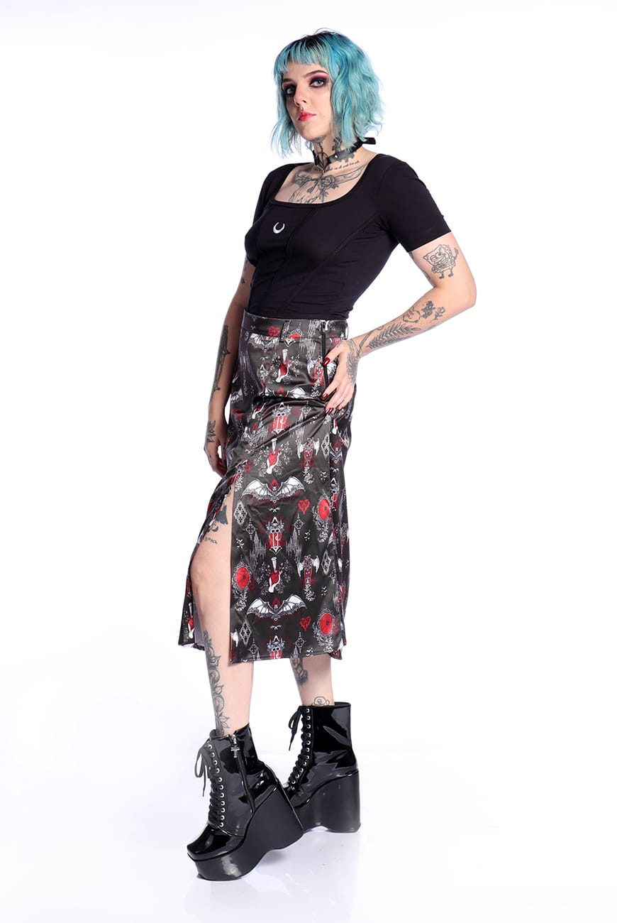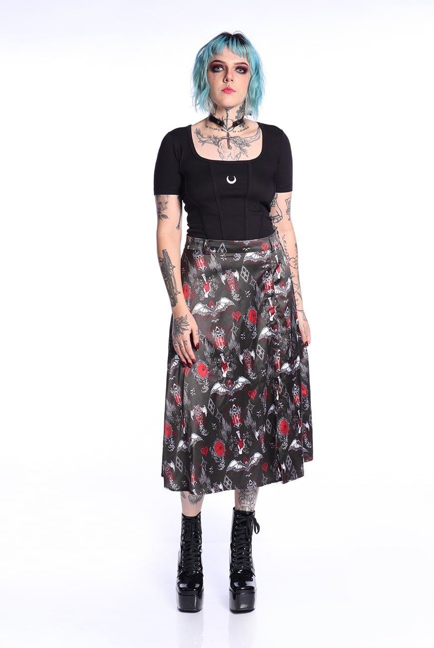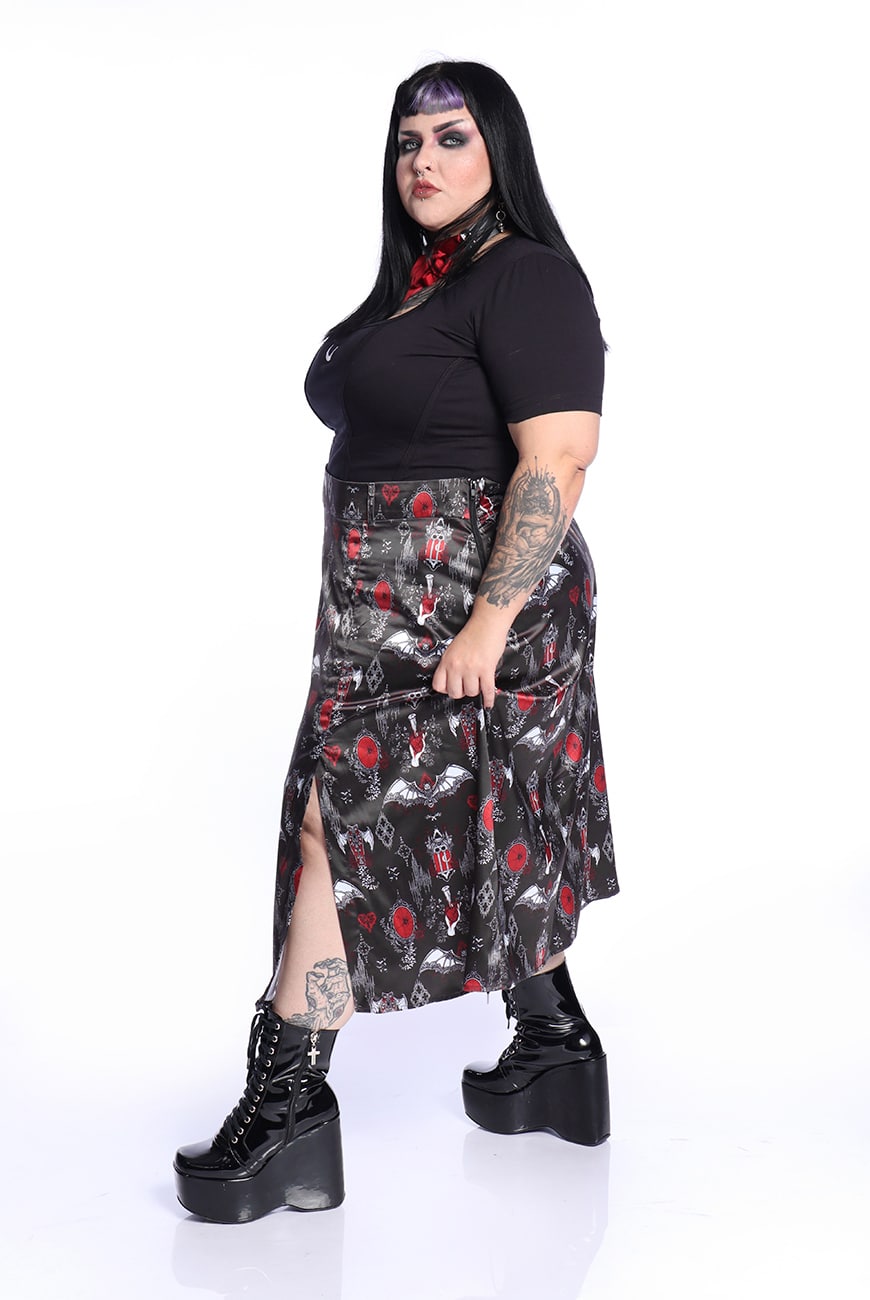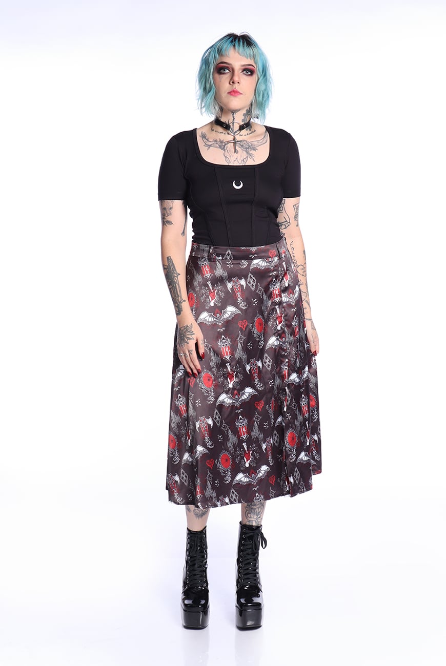 A Saia Midi Dracul tem modelagem evasê, comprimento midi e foi produzida em um cetim com toque macio e brilho sofisticado, estampado com arte exclusiva da Reversa!