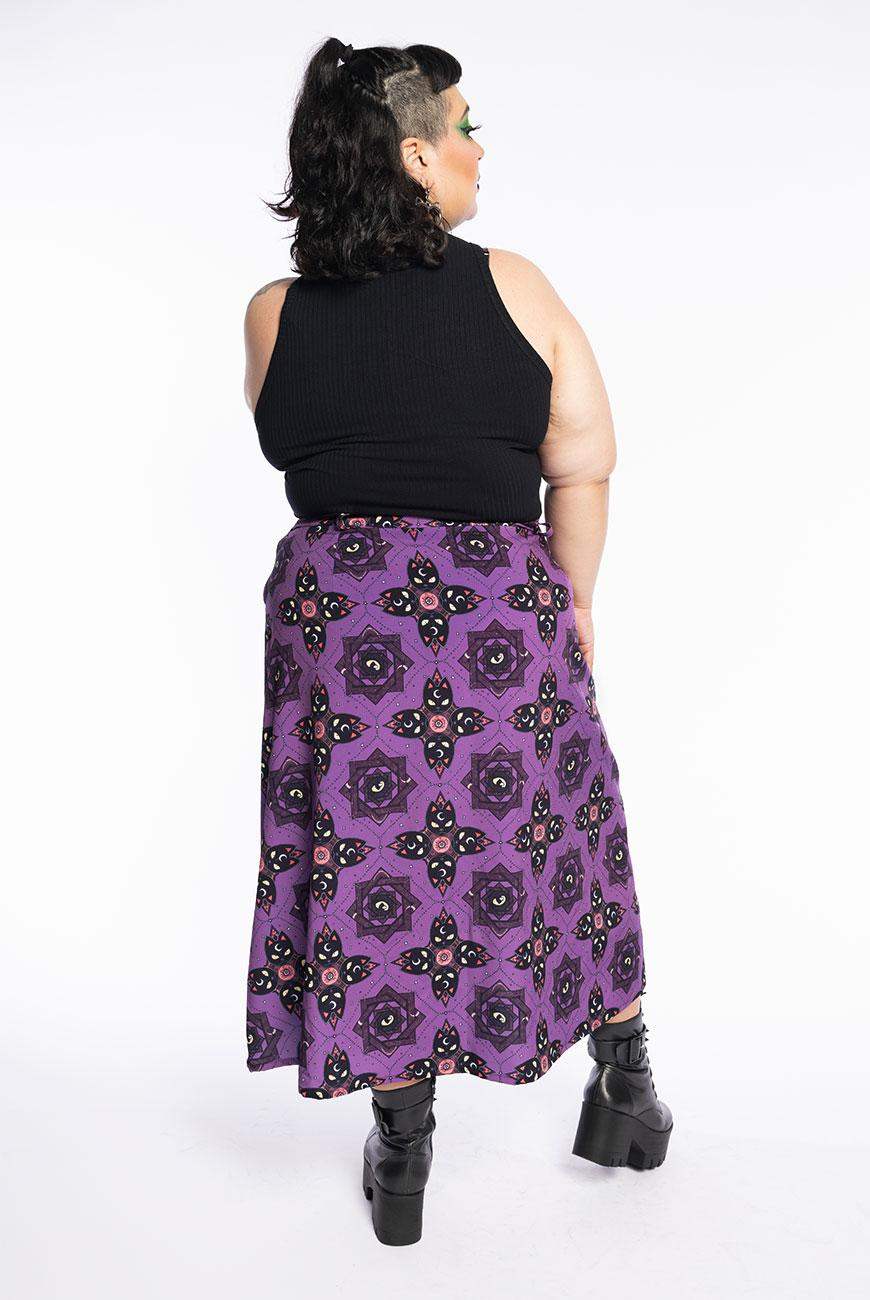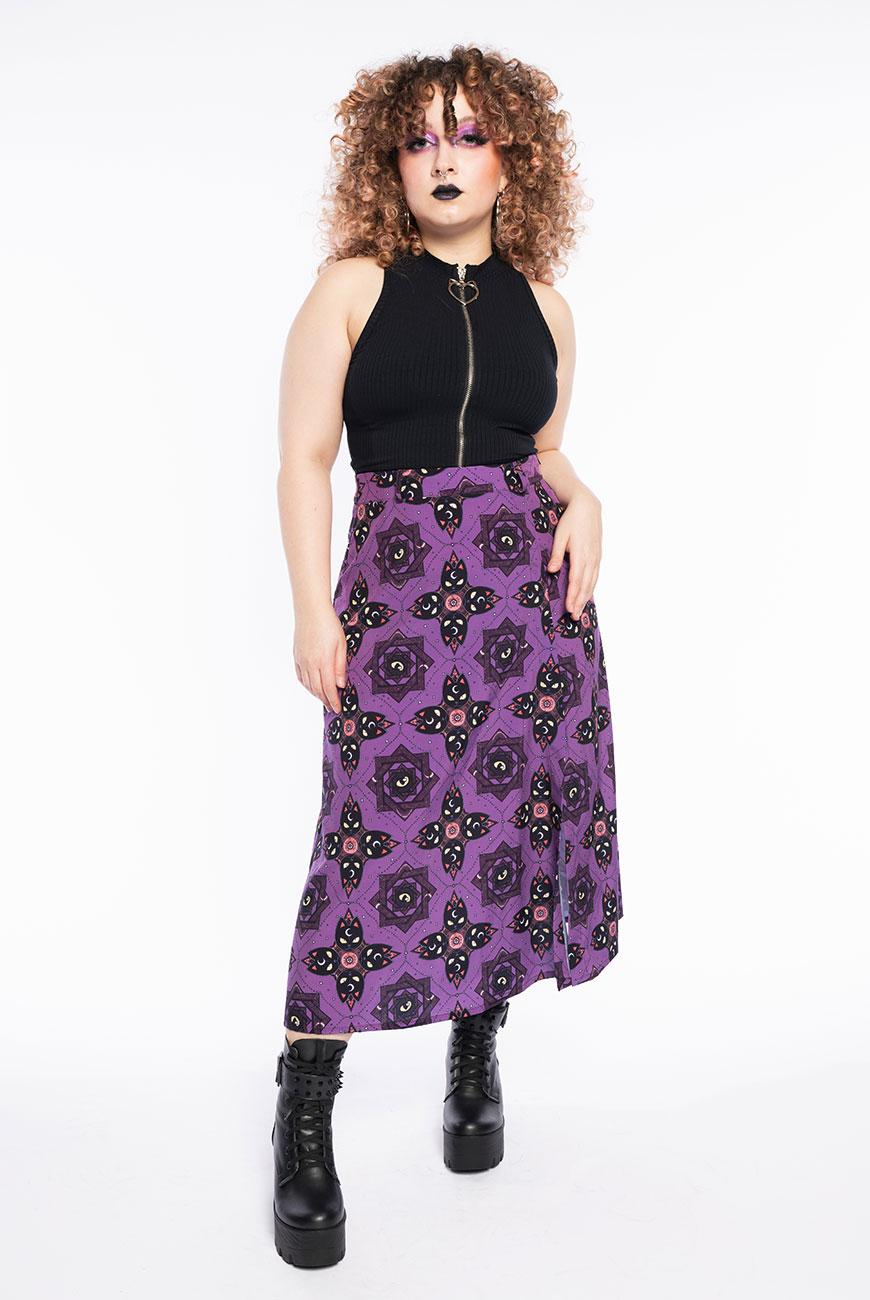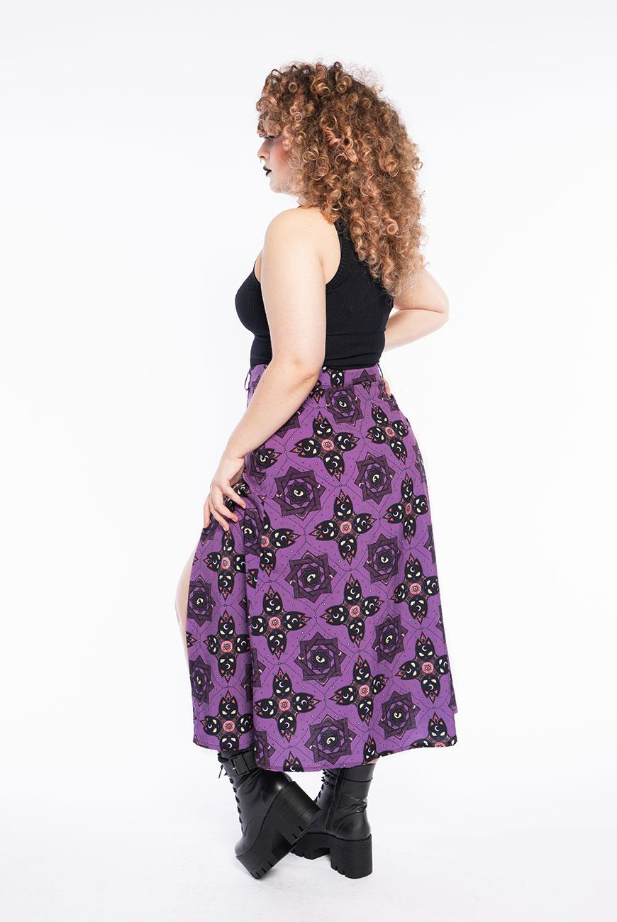 Gatos pretos, luas, bruxaria? Temos! Saia midi evasê feita em tecido leve, com nossa estampa exclusiva Kaleidoscat. Com fechamento por zíper na lateral, passantes no cós para poder ser usada com cinto e uma fenda lateral maravilhosa pra valorizar o look!nFica íncrivel com nosso Top Halter Bad Kitty e o Cinto Spikes Catwoman.