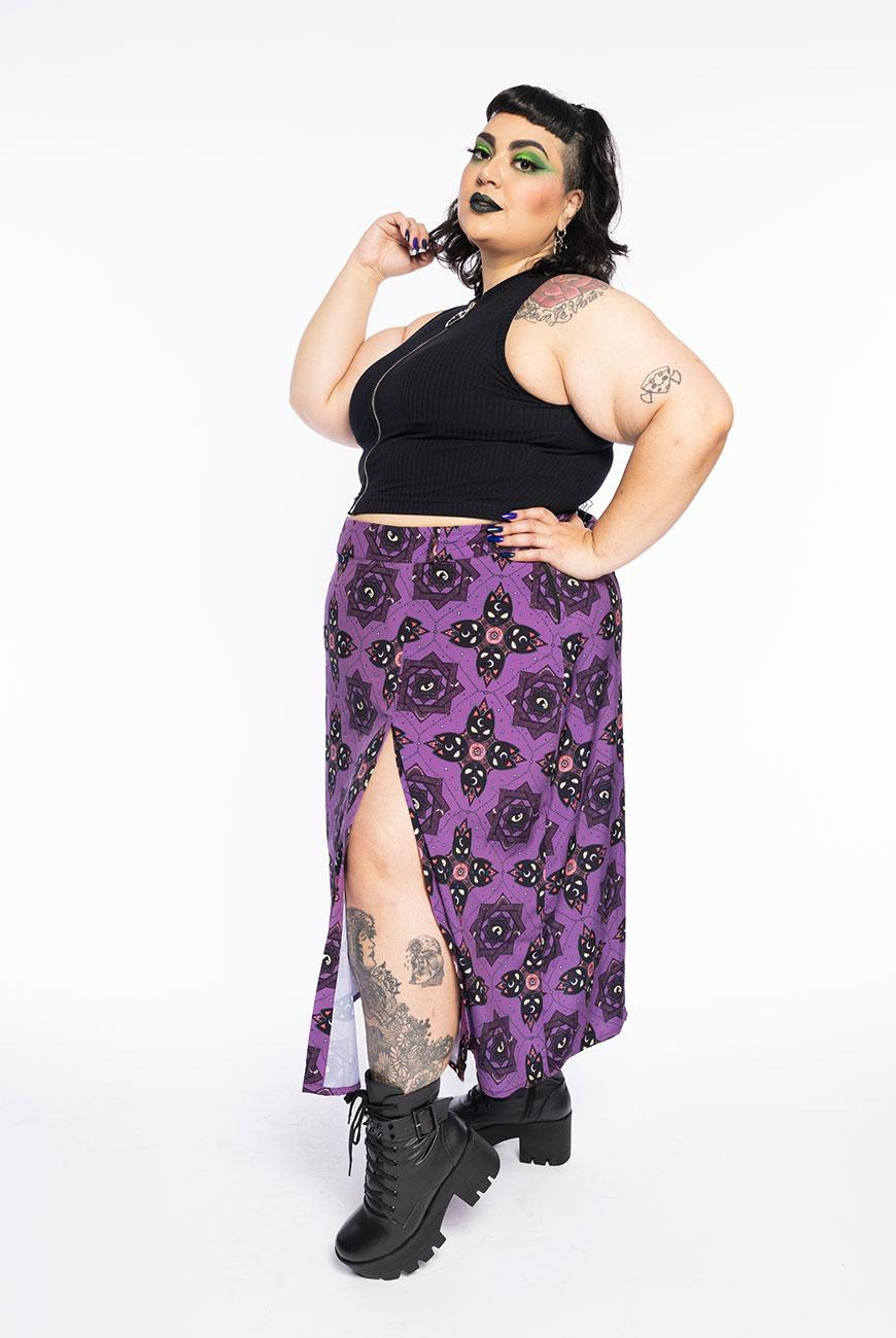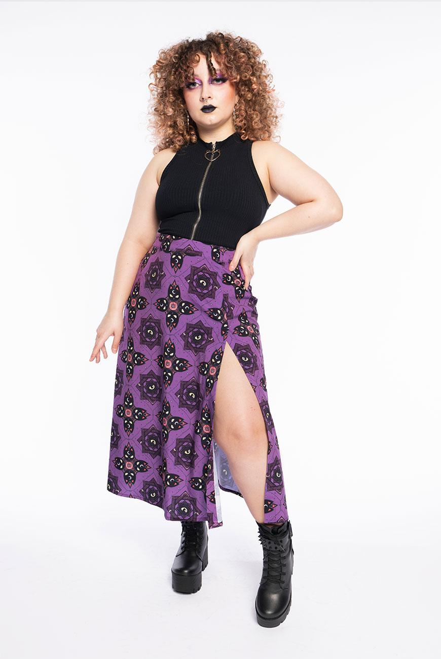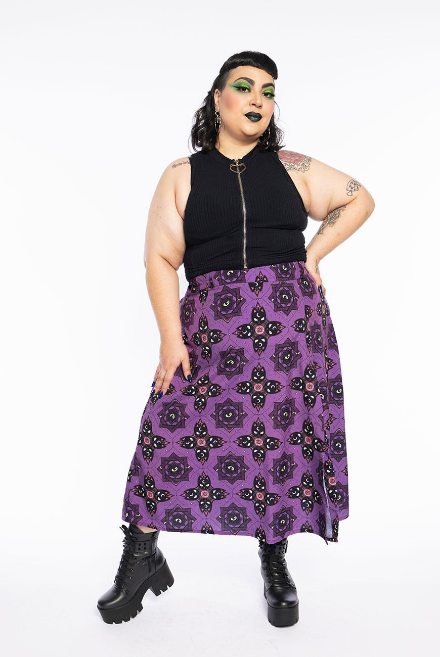 Gatos pretos, luas, bruxaria? Temos! Saia midi evasê feita em tecido leve, com nossa estampa exclusiva Kaleidoscat. Com fechamento por zíper na lateral, passantes no cós para poder ser usada com cinto e uma fenda lateral maravilhosa pra valorizar o look!nFica íncrivel com nosso Top Halter Bad Kitty e o Cinto Spikes Catwoman.