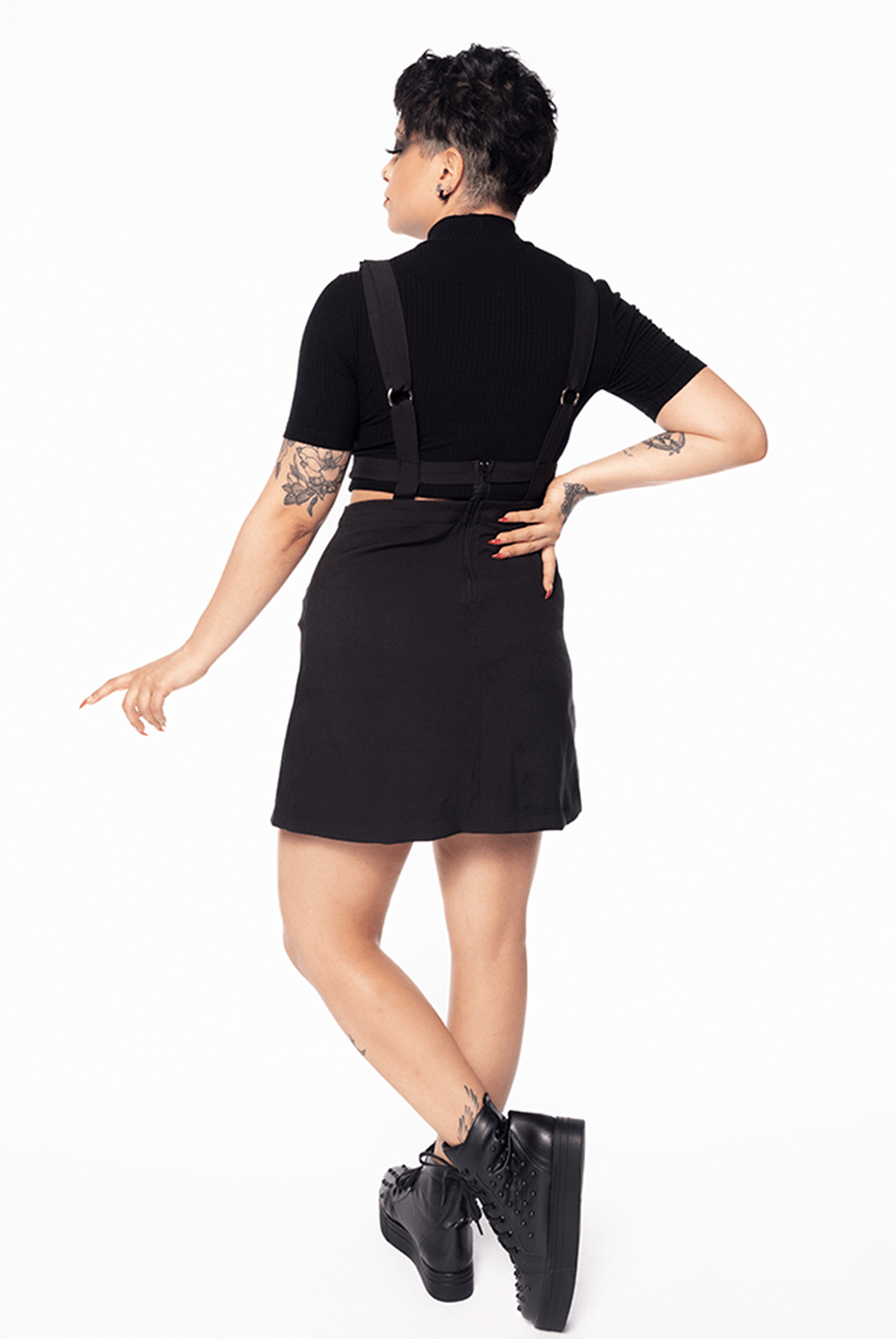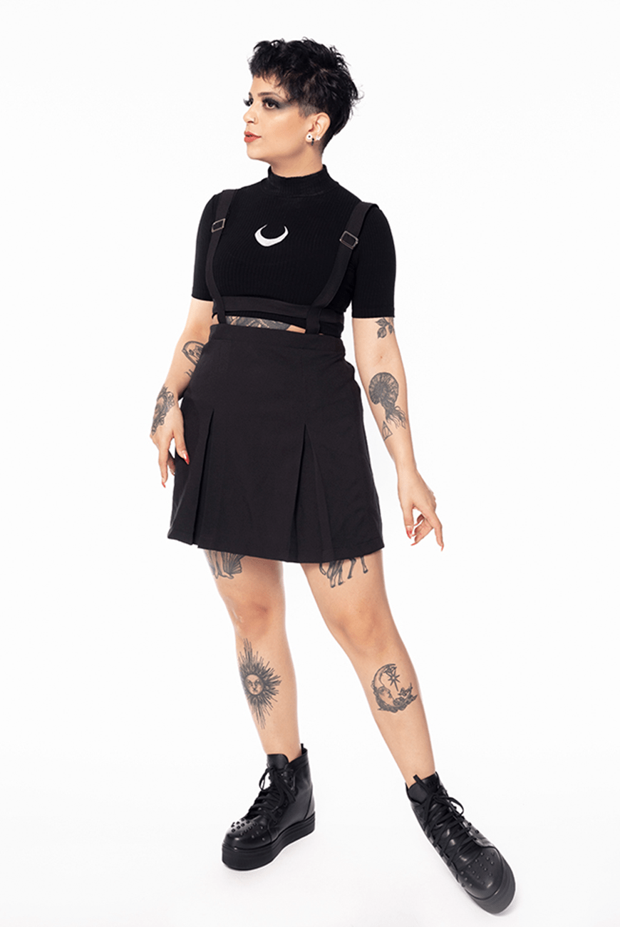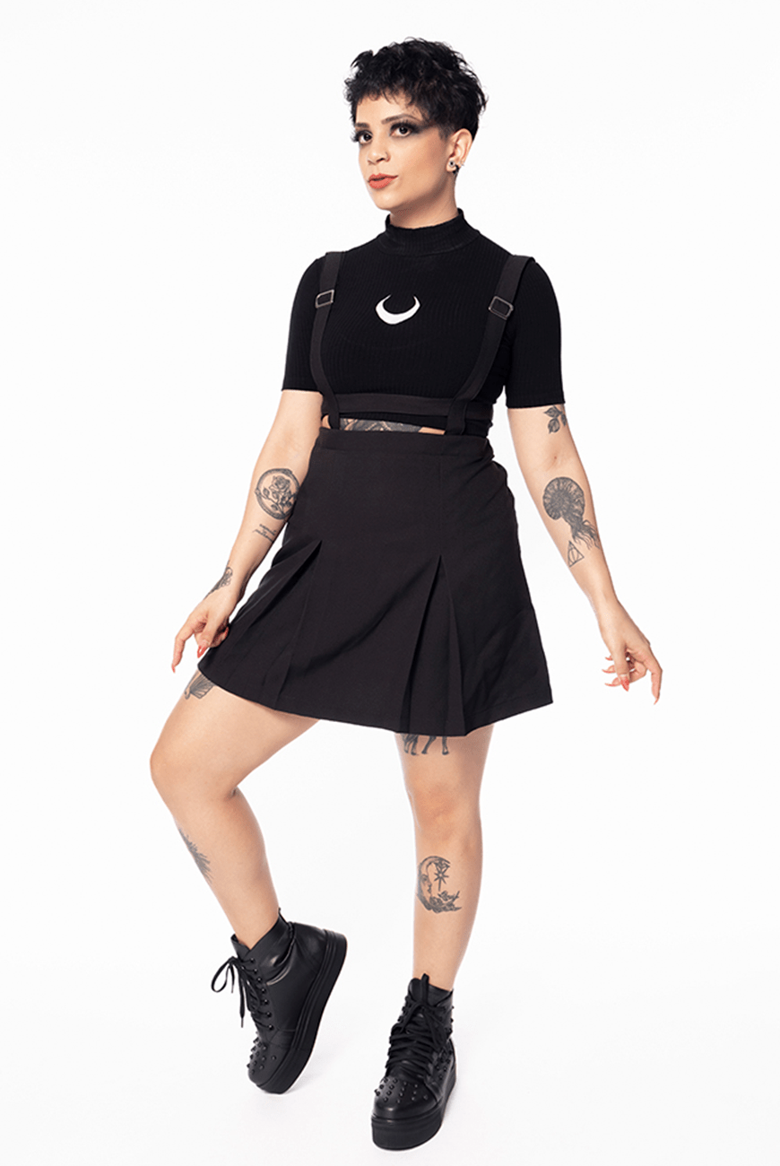 Saia cintura alta com pregas na parte frontal e detalhe de suspensório embutido com alças reguladoras e zíper traseiro para facilitar ao vestir. Super confortável e único, perfeito para trabalhar sobreposições usando a sua blusa preferida por baixo, combinando com meia-calça também!