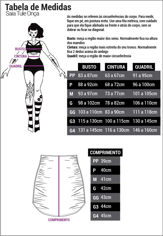 Modelo tamanho M: Altura: 1,60m/ Cintura: 72cm/ Busto: 91cm/ Quadril: 106cm.