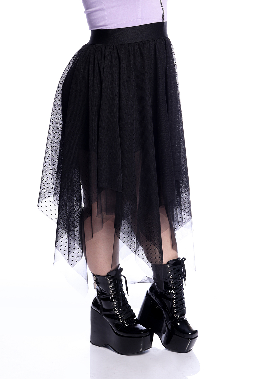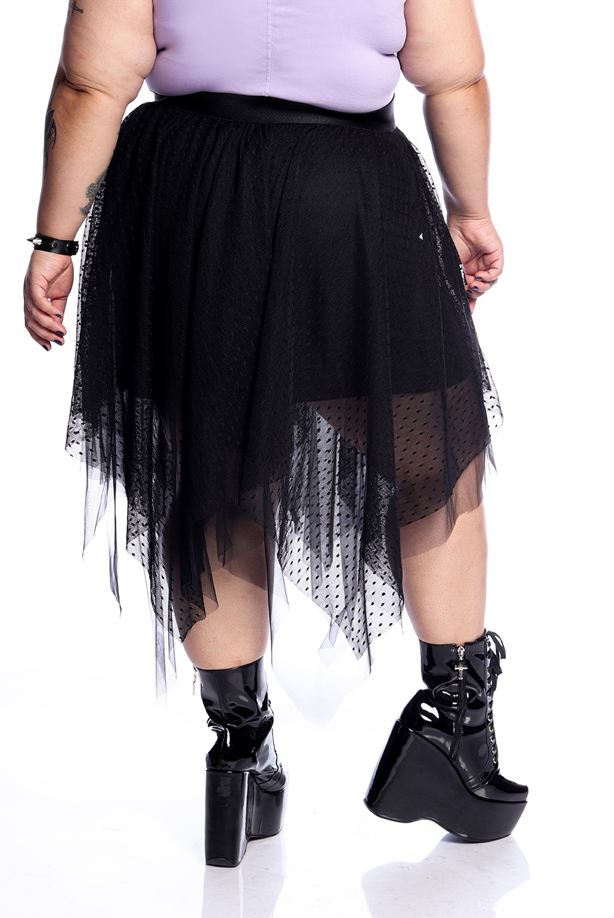 A Saia Tule Pontas Imaginary tem modelagem godê com pontas assimétricas e foi produzida em dois tipos de tule: um liso e outro com uma estampa poá super sofisticada.