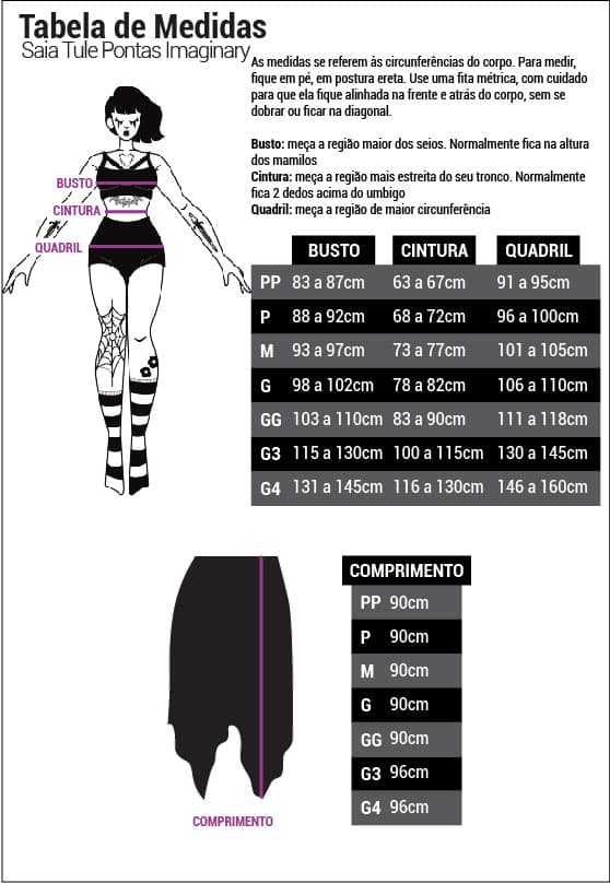 Modelo tamanho 3G: Altura: 1,60m/ Cintura: 101cm/ Busto: 121cm/ Quadril: 136cm.