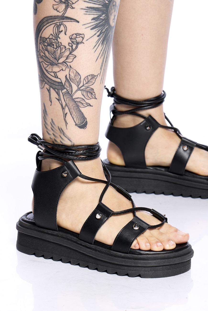 Produzida em material sintético de origem não animal, tem o solado tratorado e confortável, tiras finas cruzadas na parte de cima dos pés e detalhes de spikes niquelados no cabedal, trazendo mais peso para o modelo. O fechamento é feito por amarração no tornozelo, possibilitando diferentes propostas de styling.