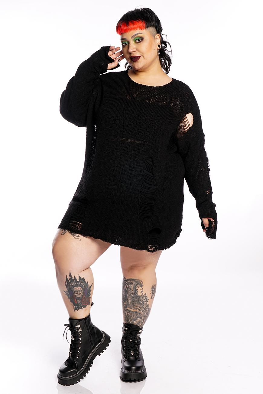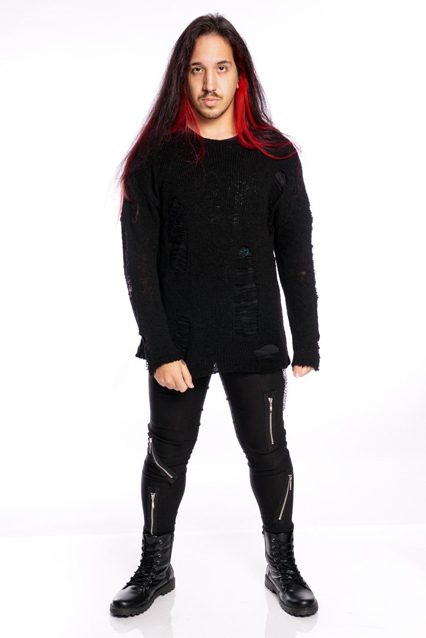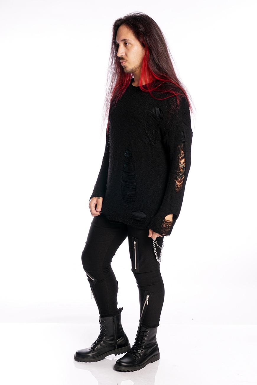 O Suéter Destroyed Preto Void é produzido em um tricot leve e com efeito puído, trazendo um visual bem alternativo e descolado.
