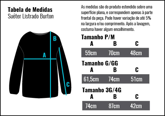 Obs: No tamanho 3G/4G, o comprimento da manga é menor devido ao caimento do ombro que acompanha a largura total da peça.