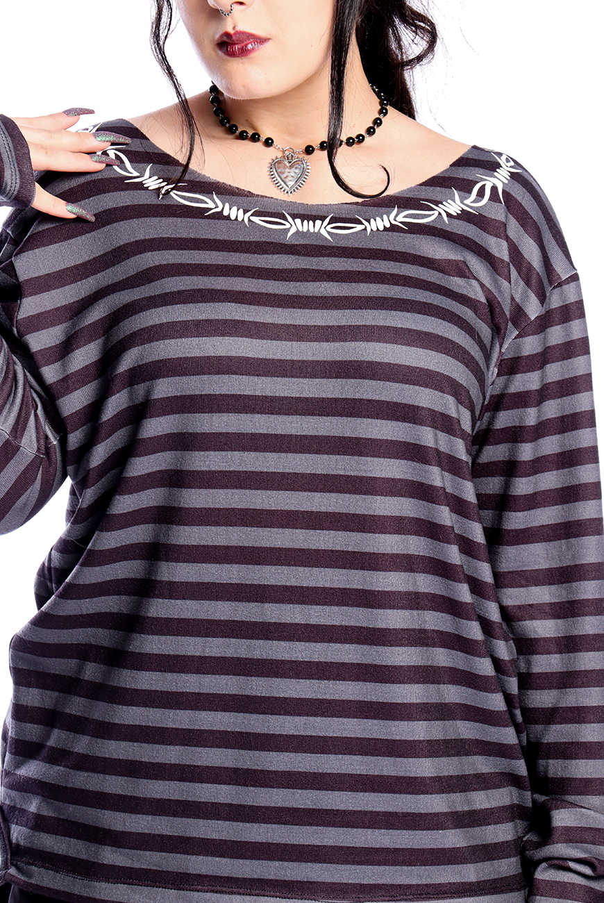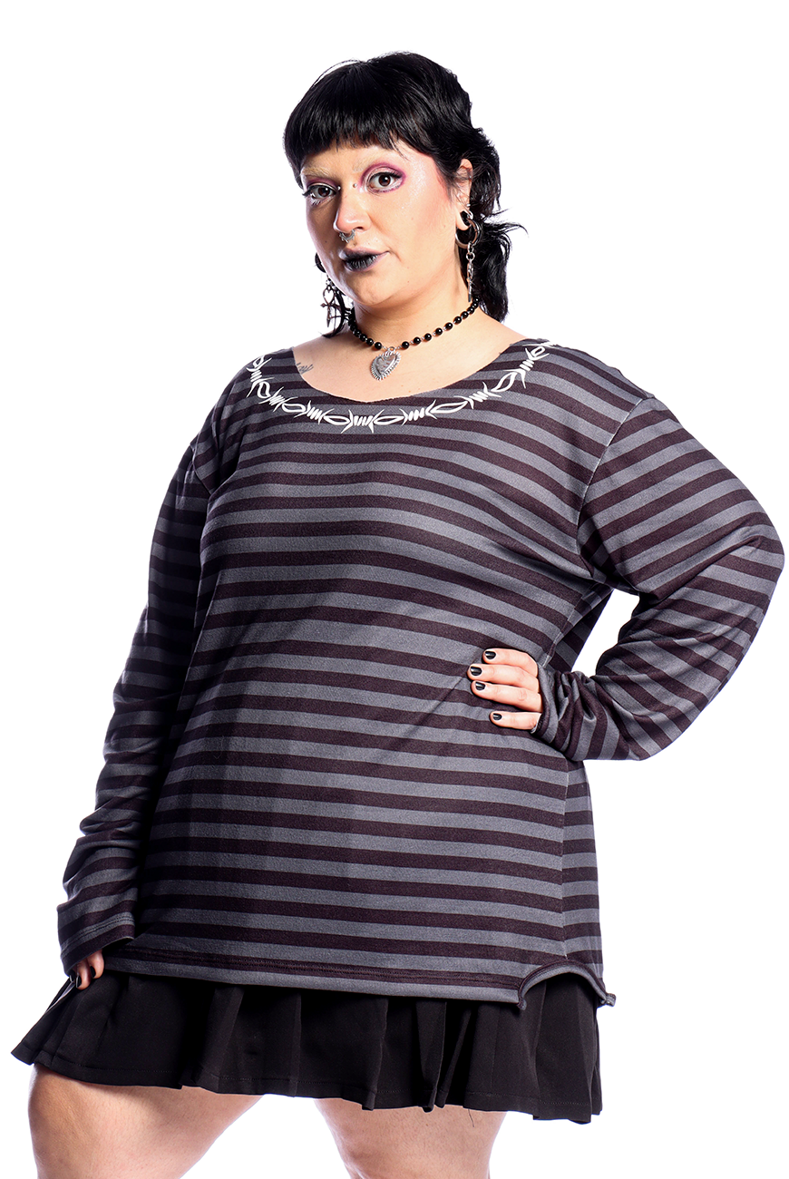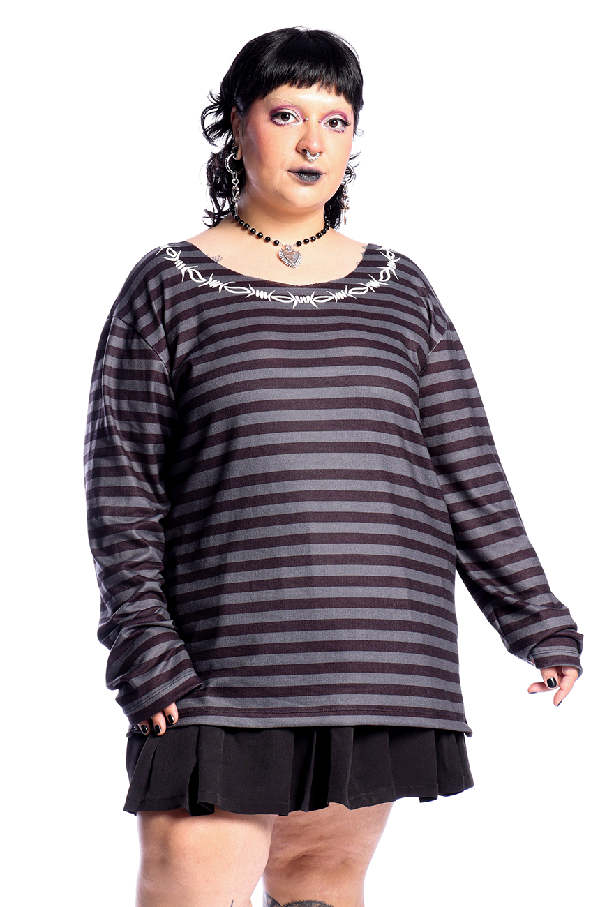 Além de ser listrado em um tom de cinza desenvolvido exclusivamente pela Reversa, possui estampa de arame farpado em serigrafia, trazendo um toque mais alternativo para o suéter.
