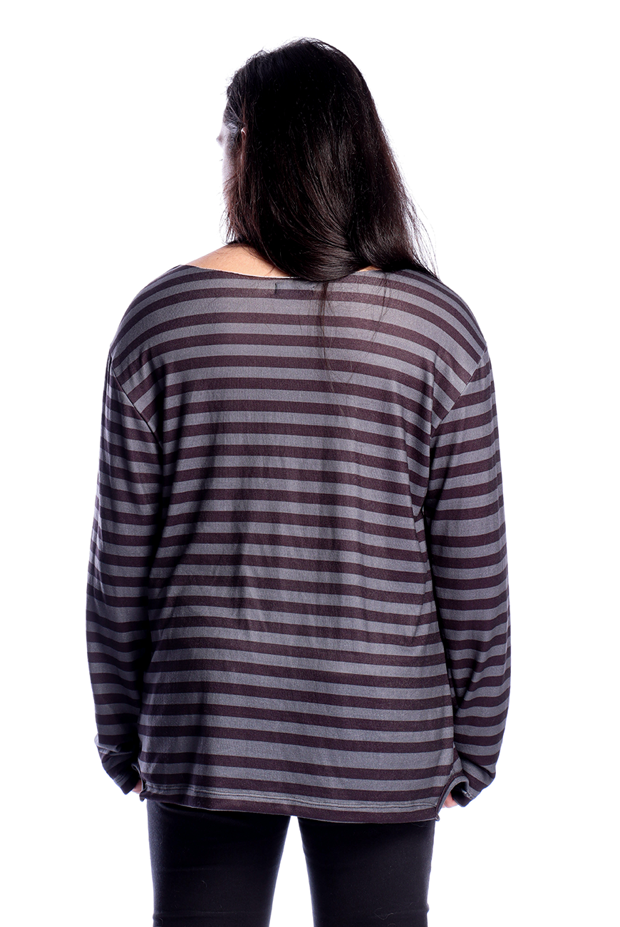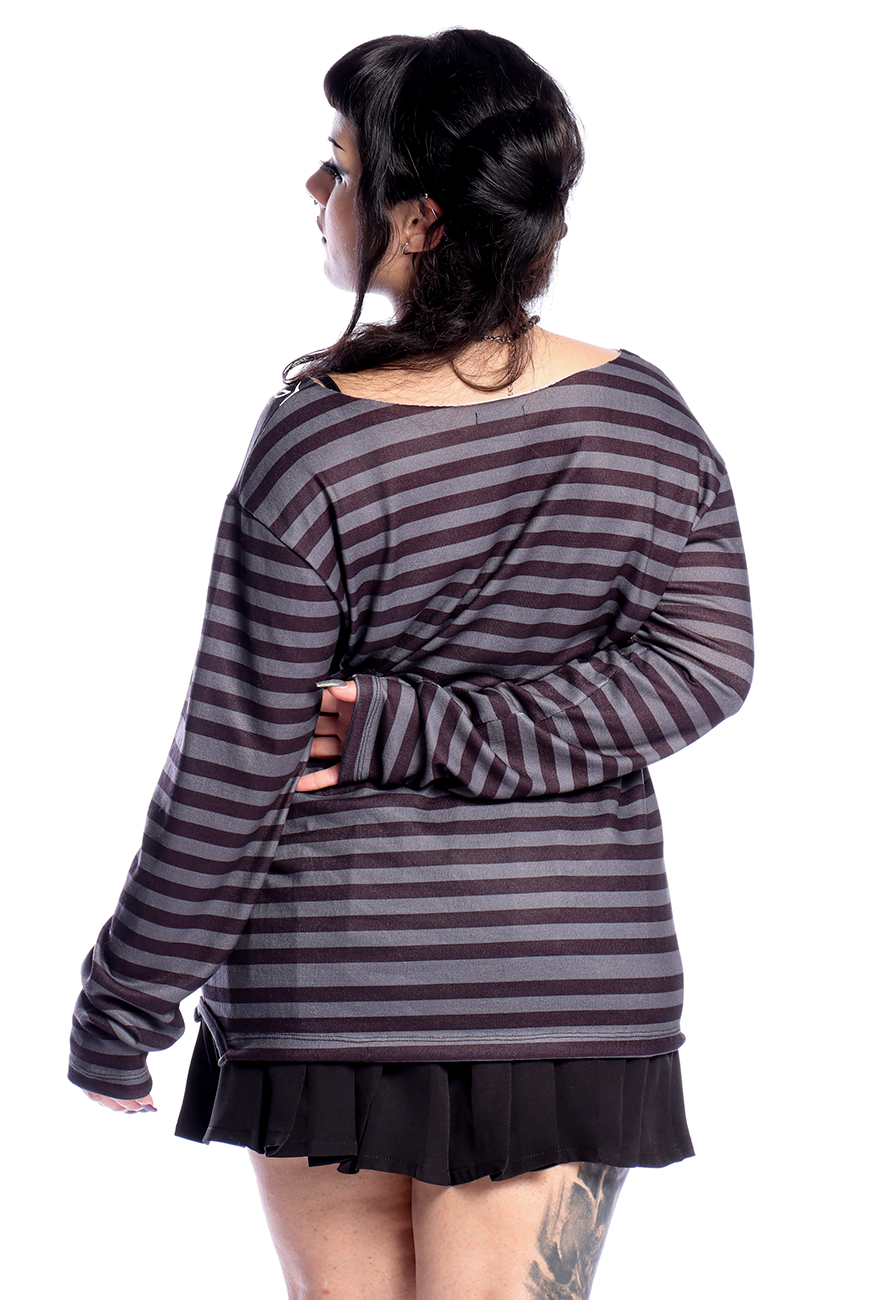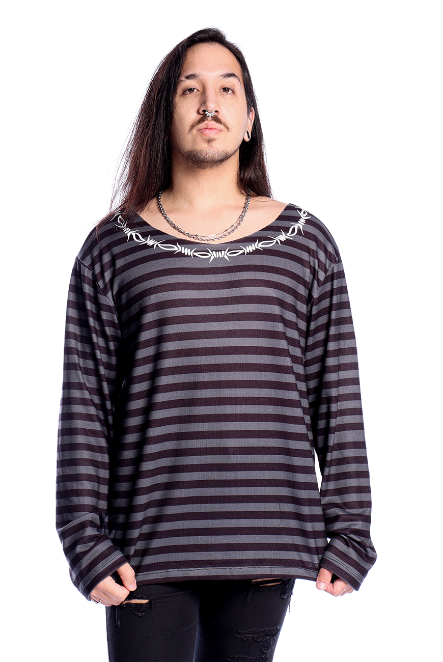 Além de ser listrado em um tom de cinza desenvolvido exclusivamente pela Reversa, possui estampa de arame farpado em serigrafia, trazendo um toque mais alternativo para o suéter.