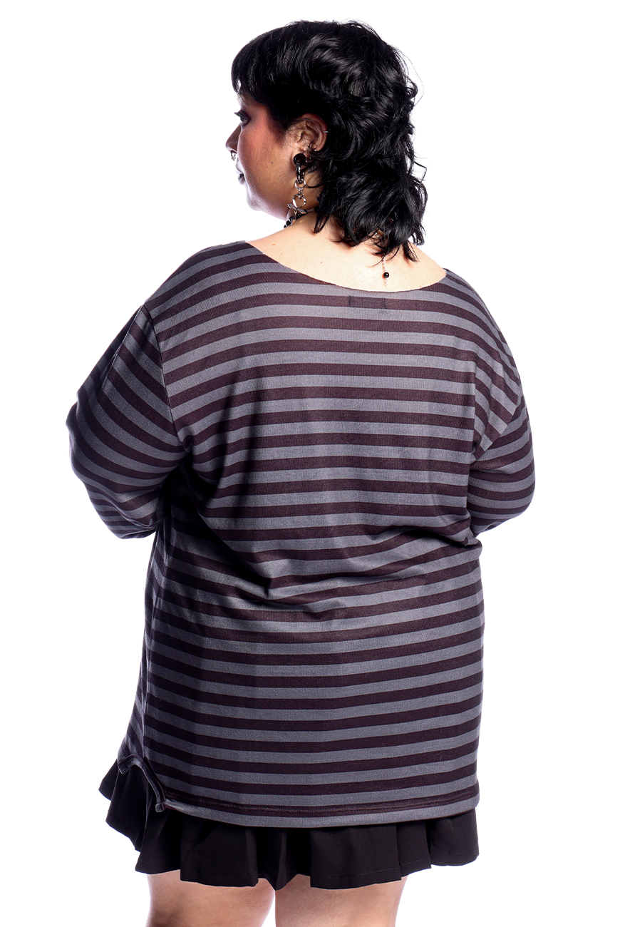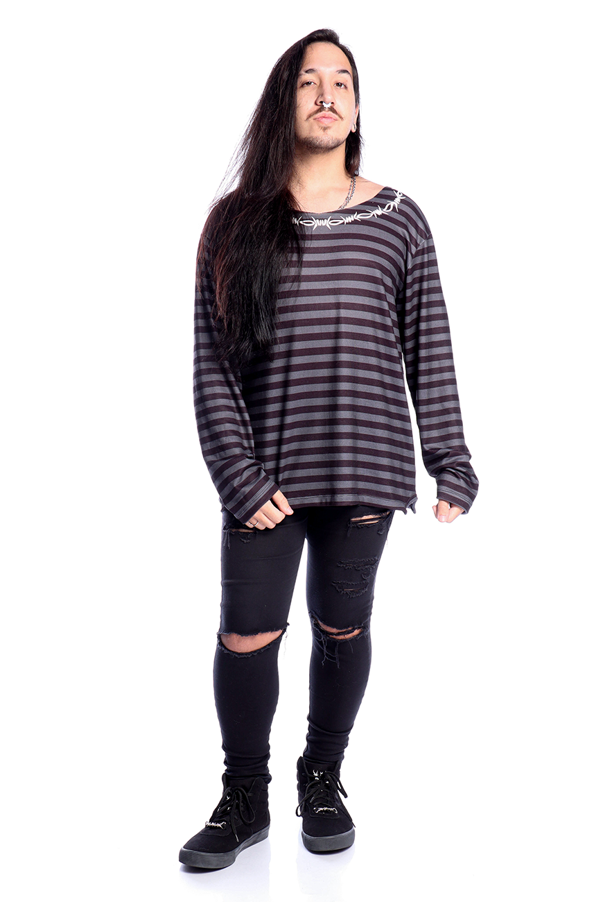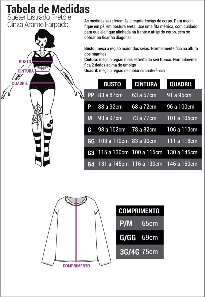 O Suéter Listrado Preto e Cinza Arame Farpado é produzido em malha tricô super leve e macia e possui modelagem unissex oversized, sendo uma peça coringa para usar com os mais diversos looks.
