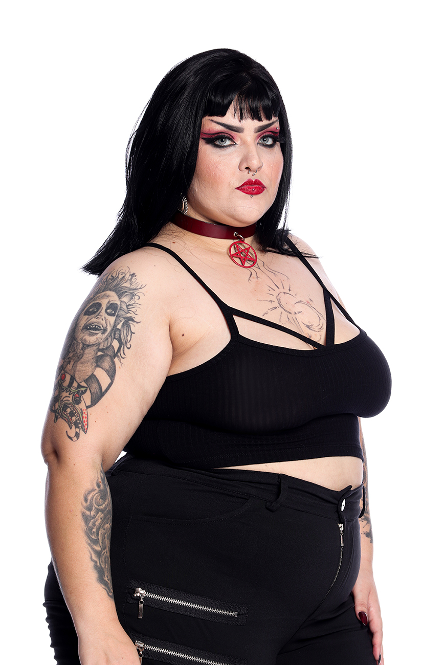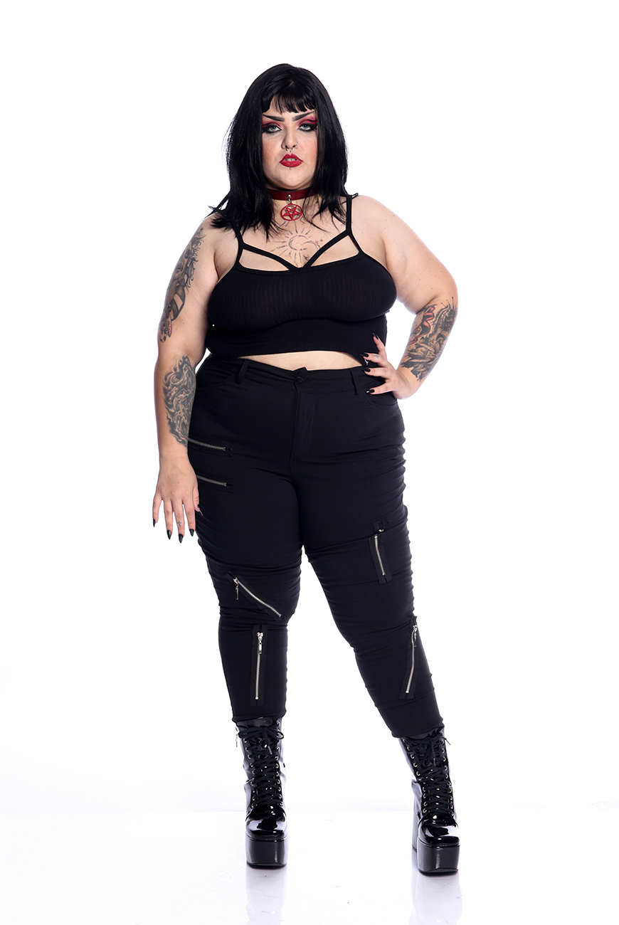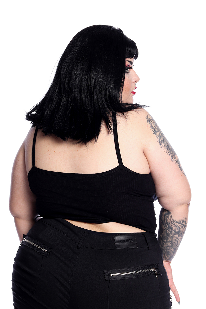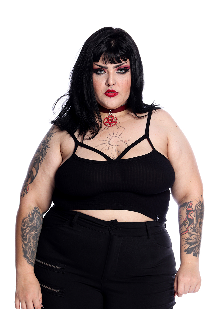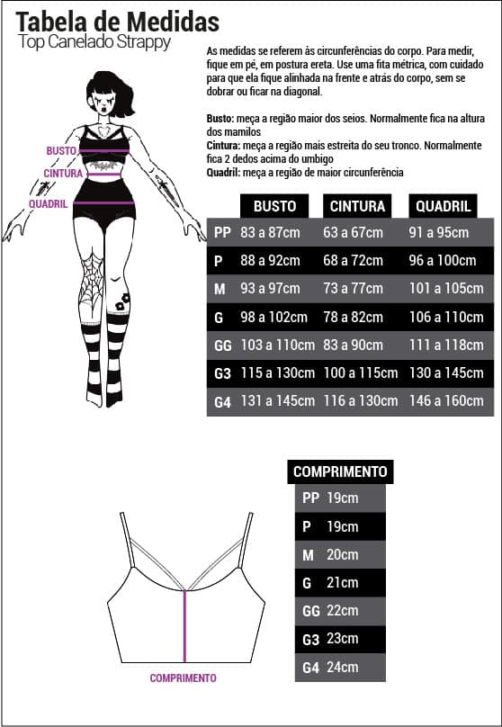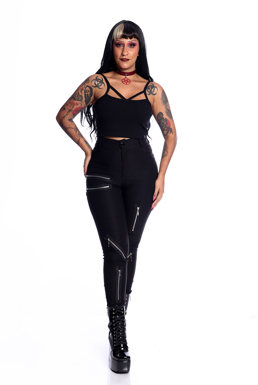Top com alças feito em malha canelada, super macio e confortável, e com o detalhe que toda gótica ama: tiras no decote! Aquela peça chave para dar o toque final no look.
