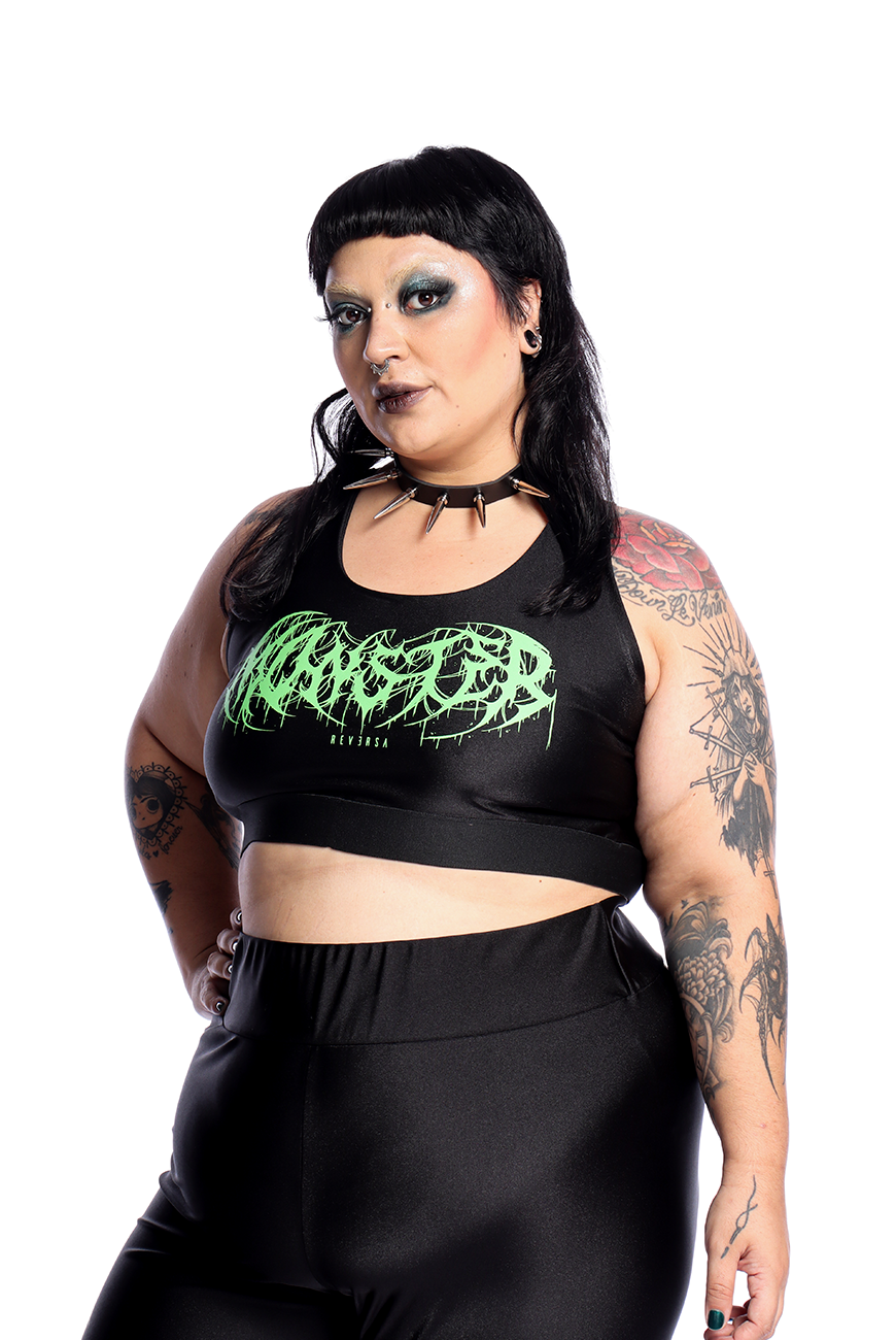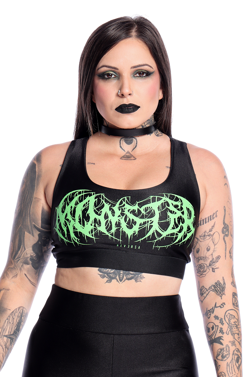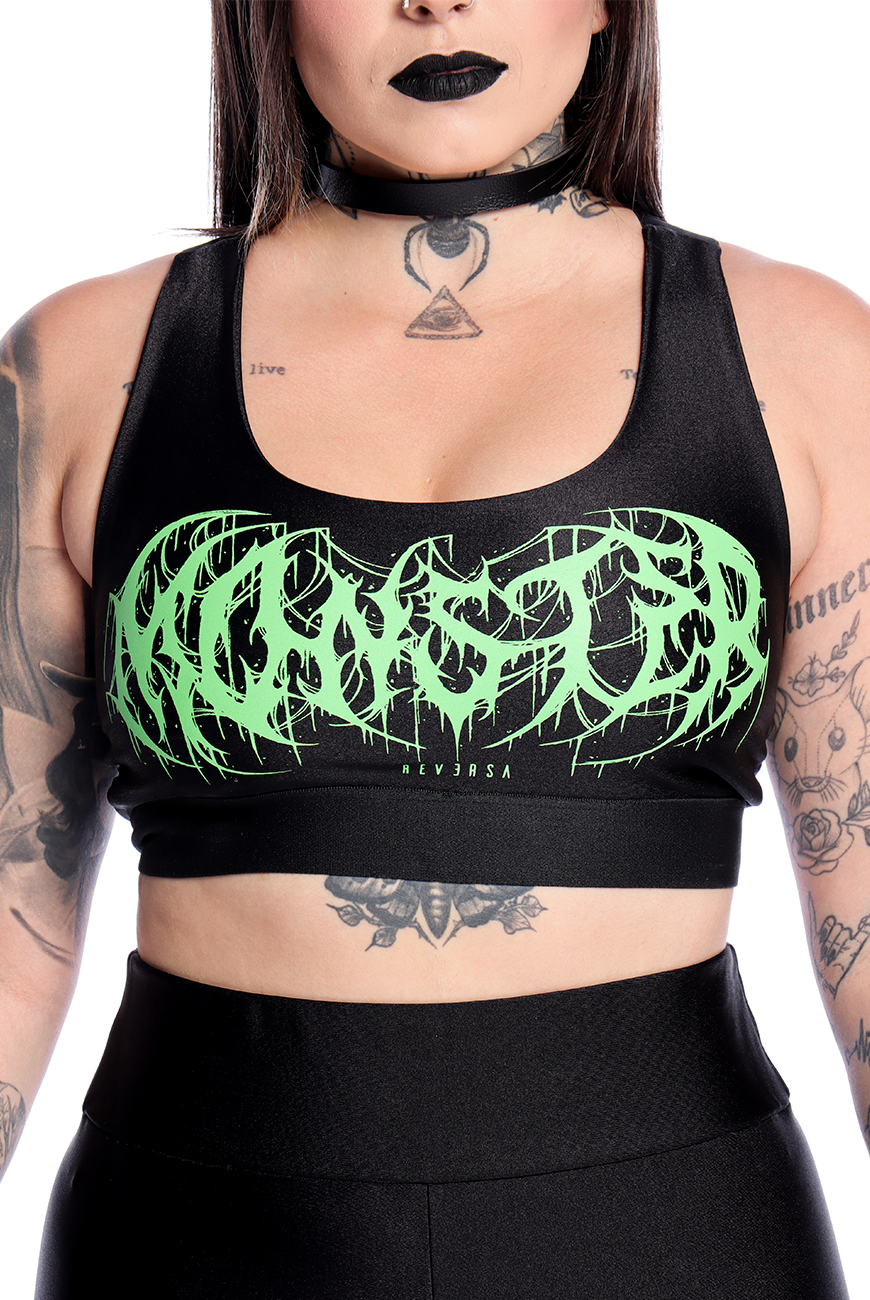 O Top Fitness Monster foi desenvolvido com a frente dupla para dar mais sustentação ao busto e tiras de elástico super macias que cruzam nas costas. Possui estampa com lettering exclusivo da palavra “Monster”, naquele tom de verde perfeito que todo alternativo adora.