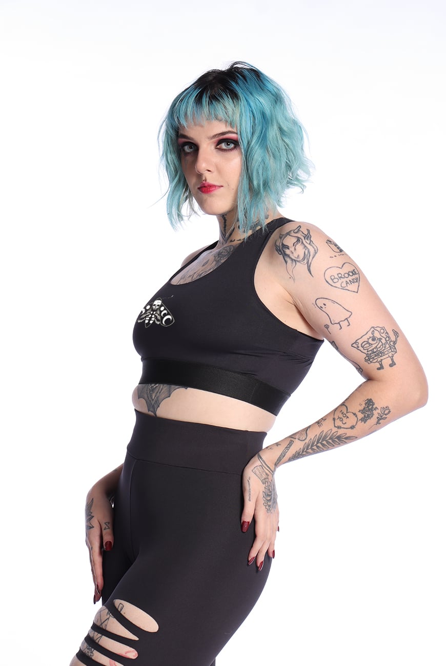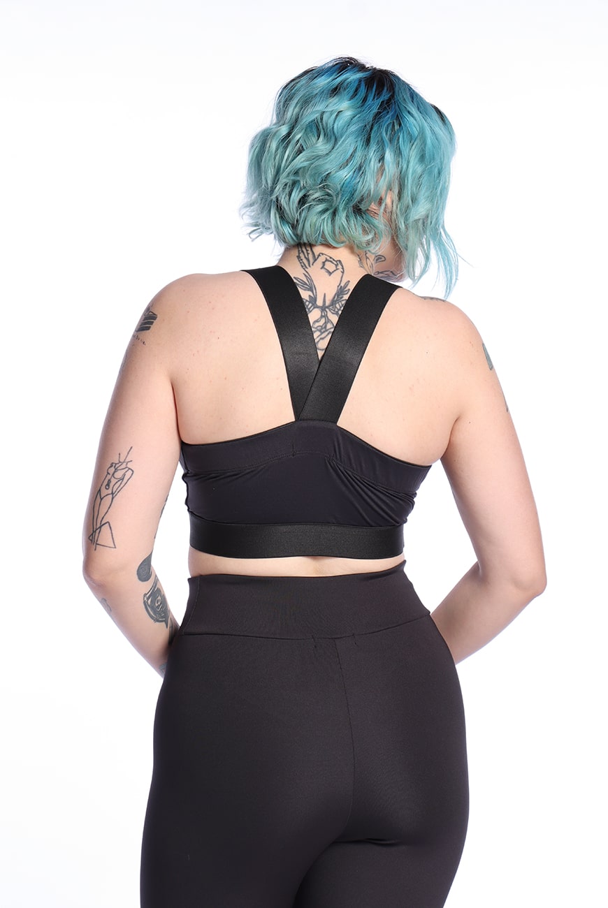 O Top Fitness Preto Mariposa foi desenvolvido com a frente dupla para dar mais sustentação ao busto e tiras de elástico super macias que cruzam nas costas, sendo ideal para usar durante seu treino.