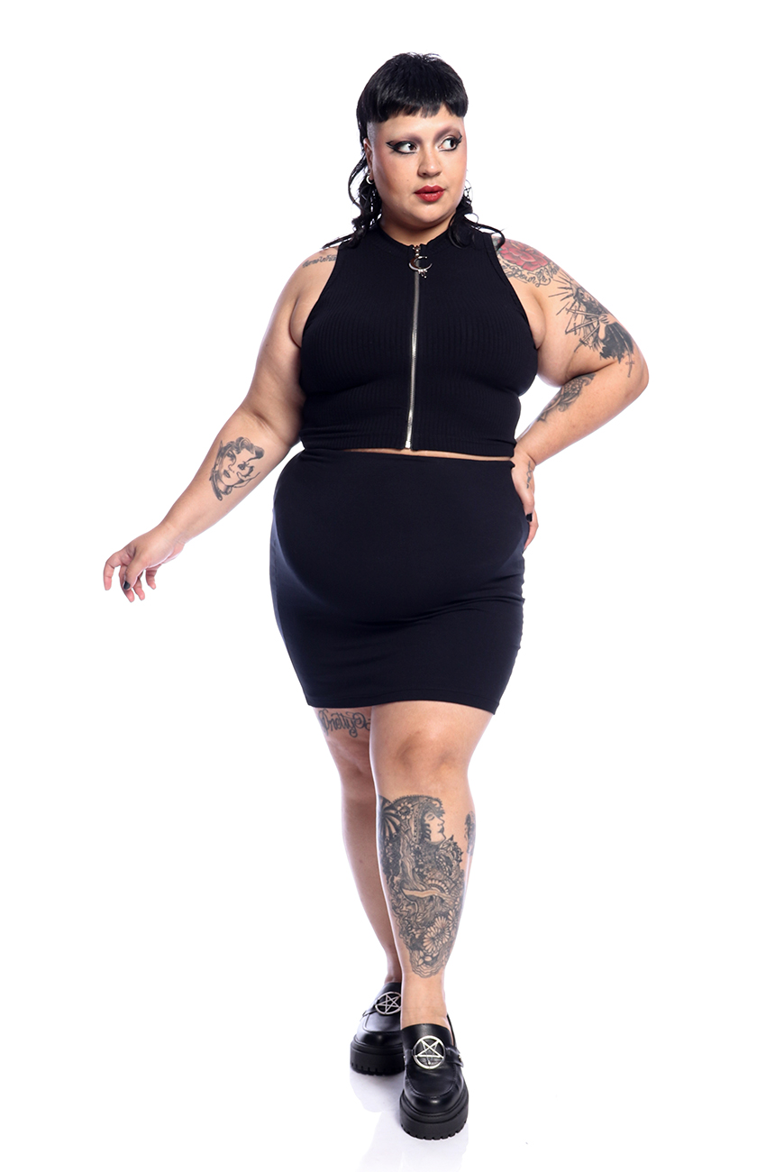 Tem abertura frontal com zíper de metal e puxador de lua niquelado exclusivo da Reversa, que possibilita você a usar o top mais decotado ou fechado.