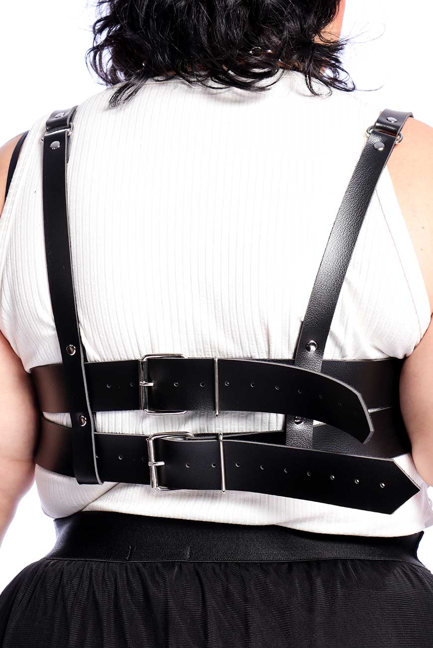 Produzido em material sintético de origem não animal, possui tiras cruzando o busto como um top, todas com fivelas reguladoras e argolas niqueladas, possibilitando diversos ajustes para diferentes corpos.