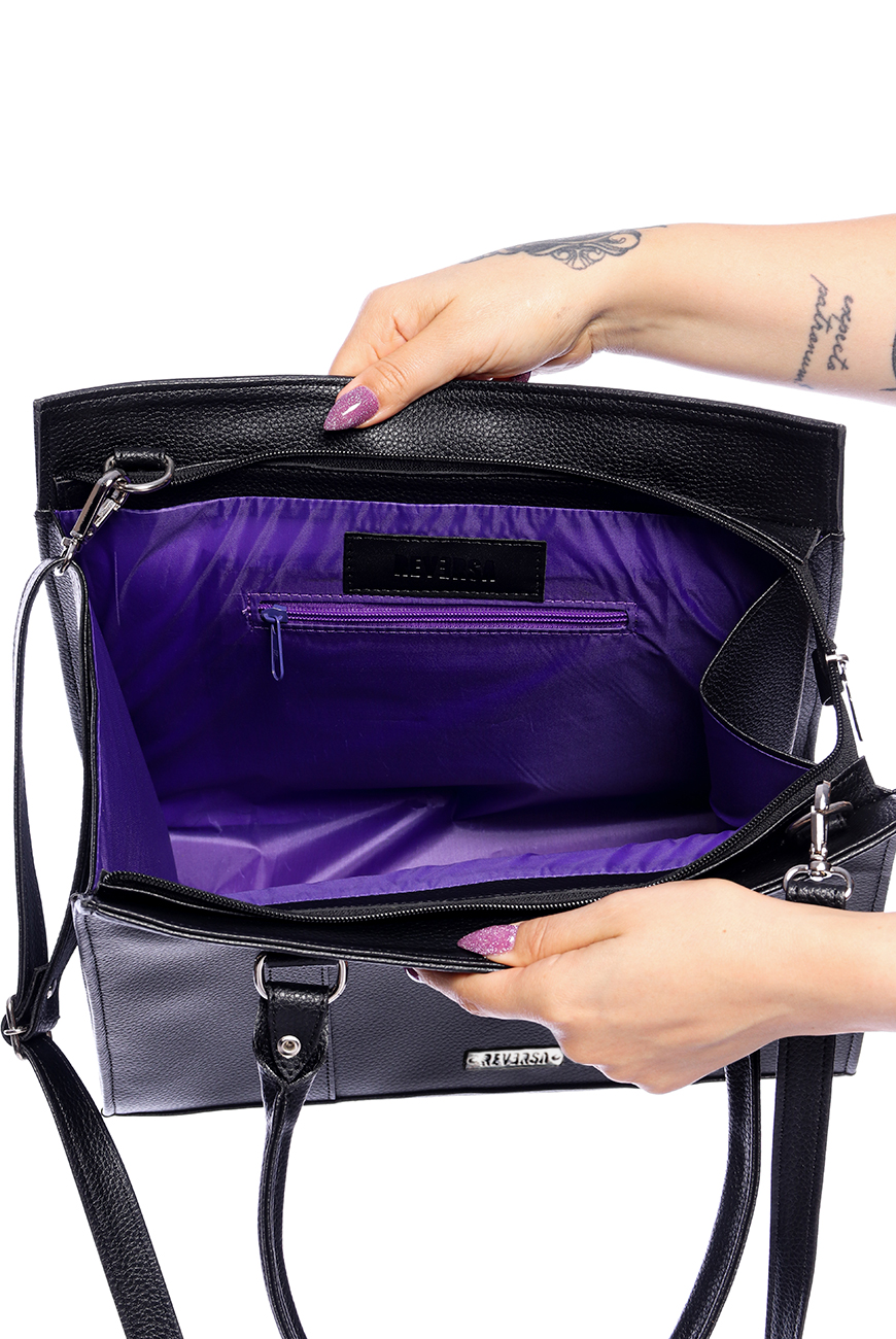 Produzida em material sintético de origem não animal, possui um compartimento principal super espaçoso, com forro na cor roxa e bolso interno com zíper para maior praticidade. Possui duas opções de alças: Uma removível, fixada na bolsa por dois mosquetes e as alças de mão que são fixas, para você usar como preferir.