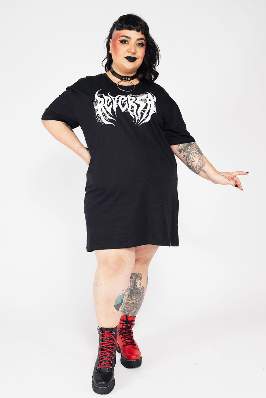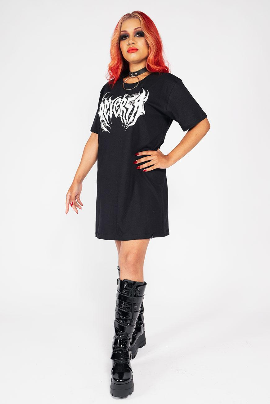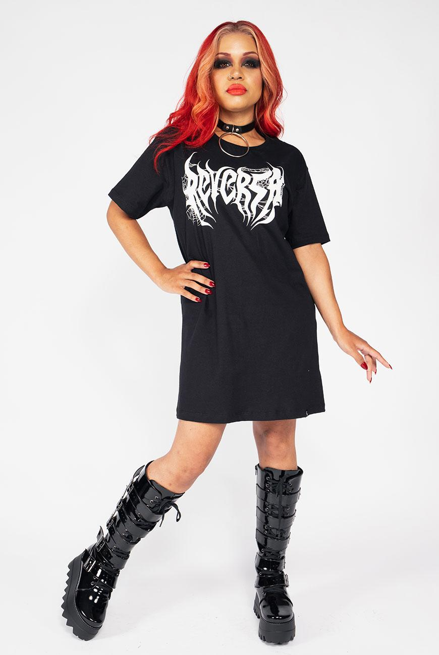 Vestido unissex com modelagem estilo camiseta e comprimento oversized, com nosso logo versão black metal e uma estampa incrível de coluna vertebral nas costas.