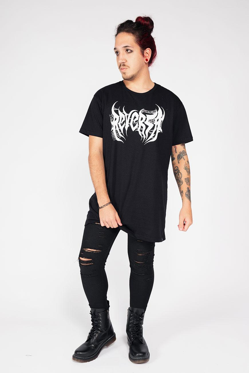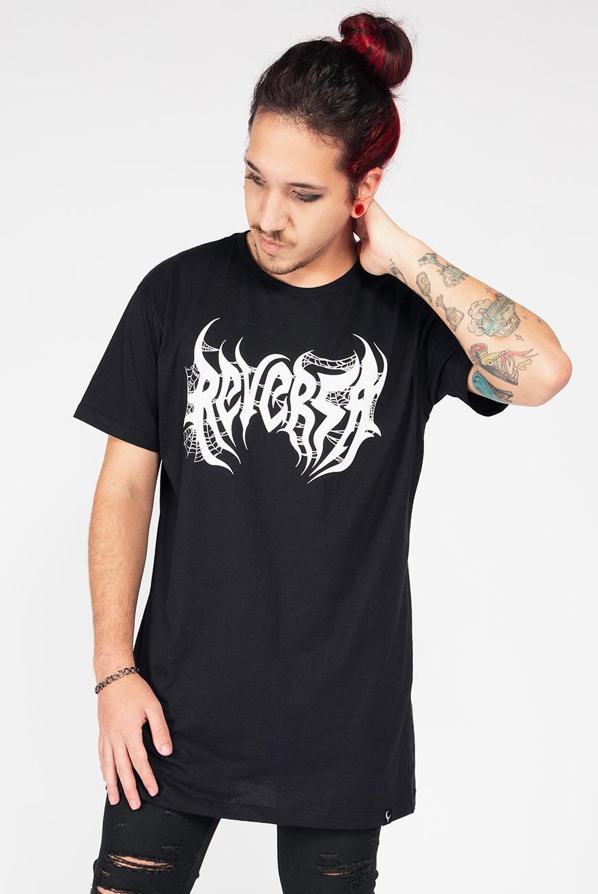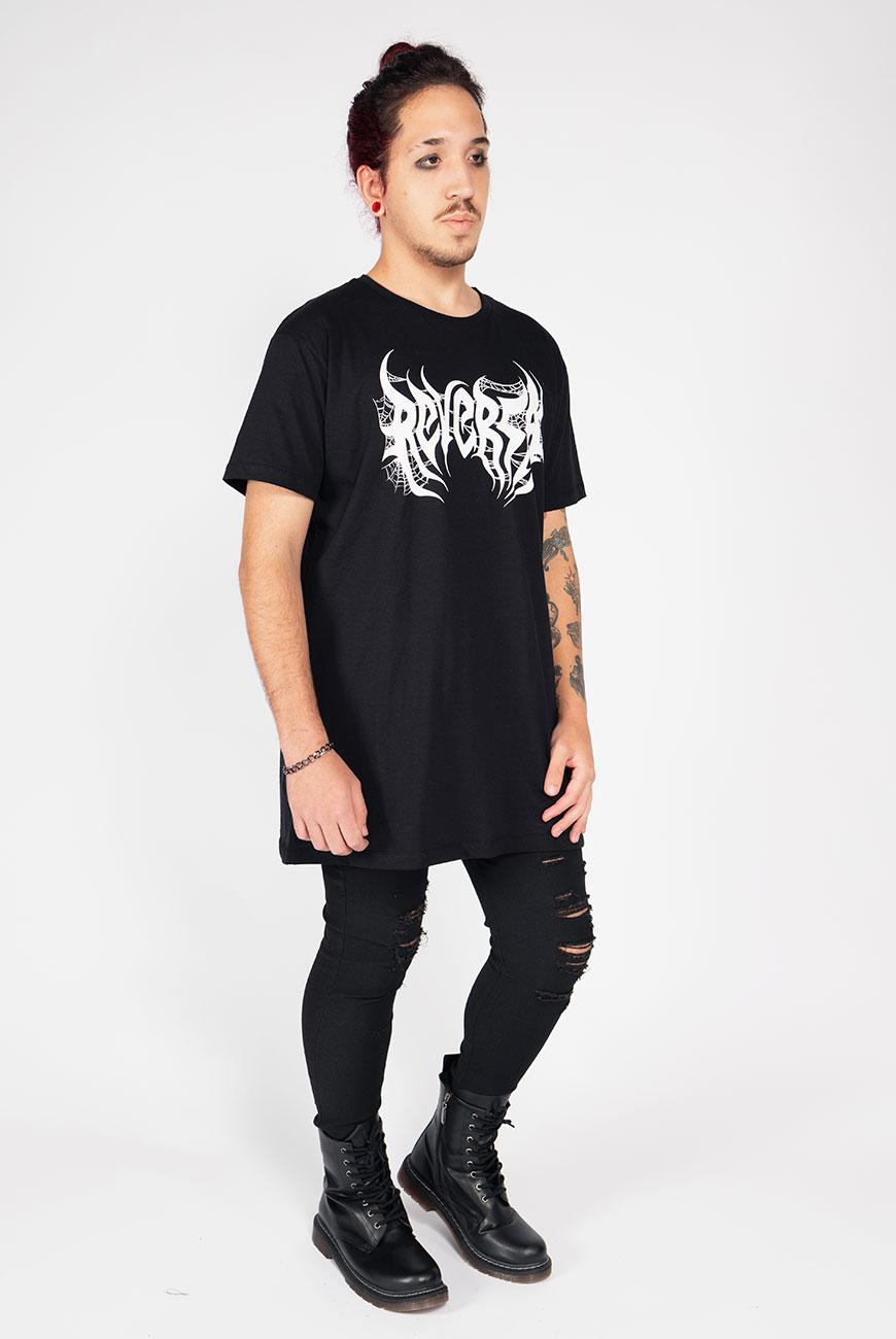 Vestido unissex com modelagem estilo camiseta e comprimento oversized, com nosso logo versão black metal e uma estampa incrível de coluna vertebral nas costas.