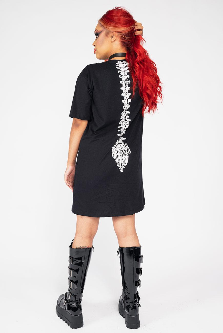 Coloque o Vestido Camiseta Spine, um choker e um coturno e já estará preparadissime pra aproveitar o Halloween com conforto e estilo.