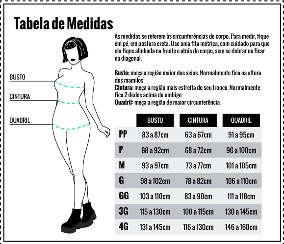 Tamanho M: Busto: 88cm/ Cintura 70cm/ Quadril 94cm