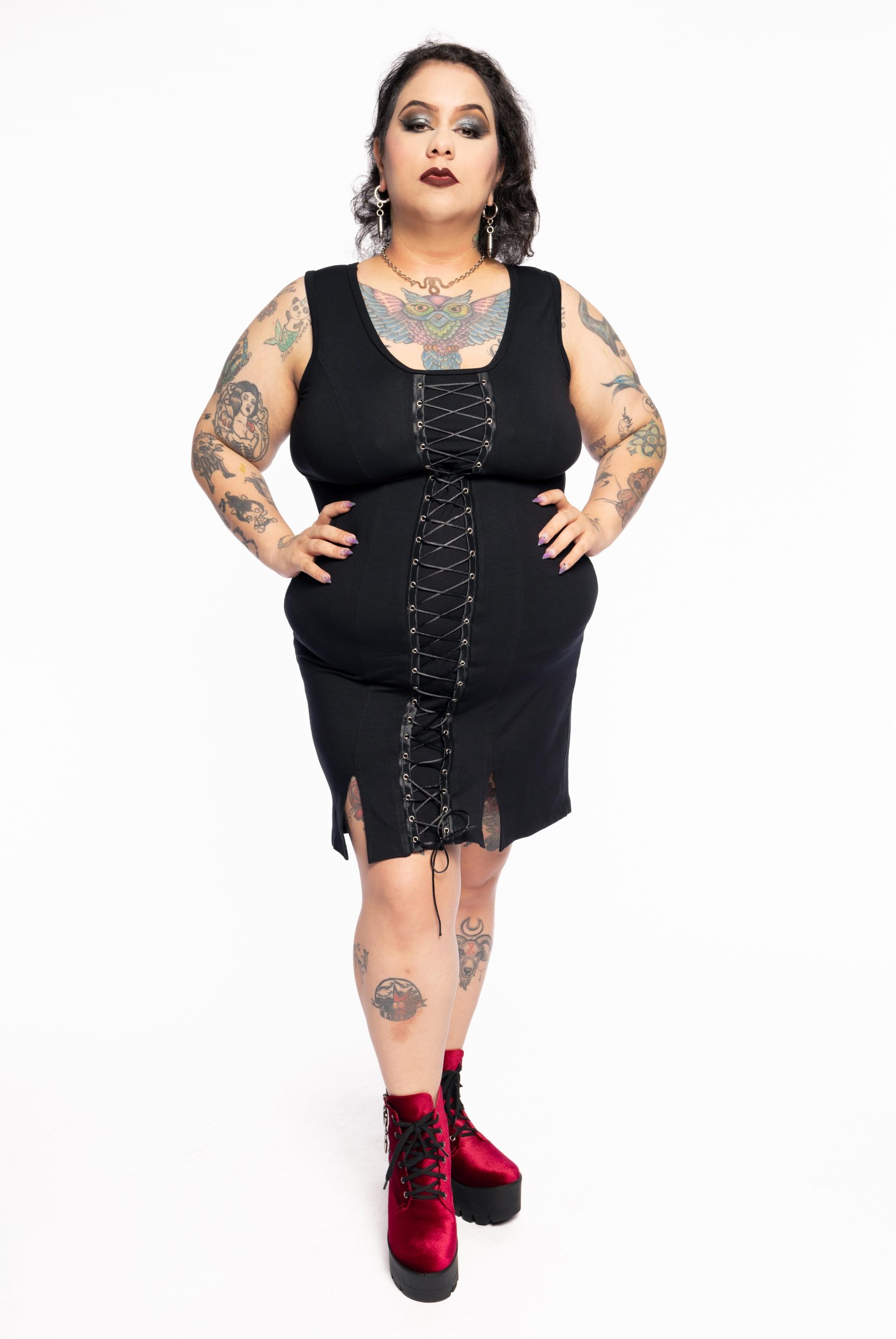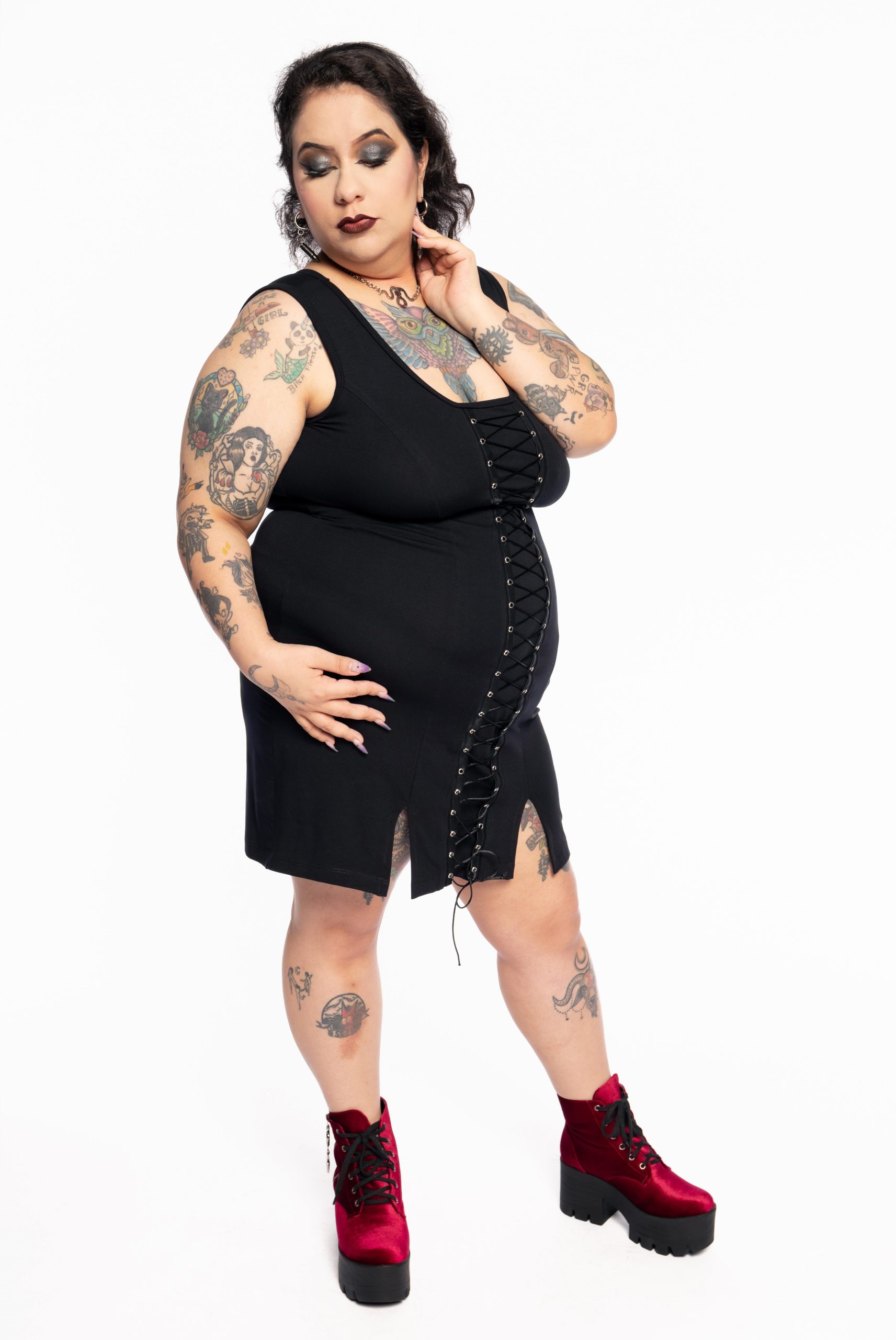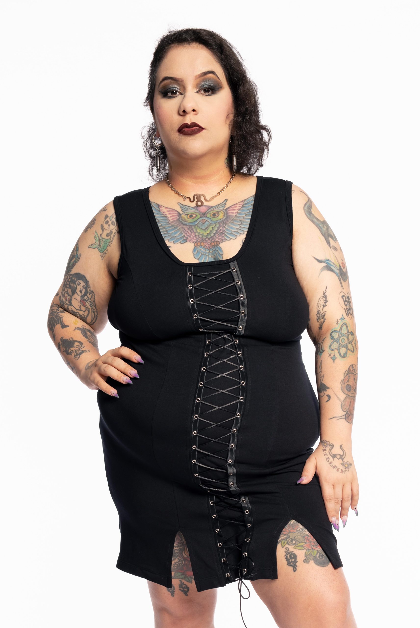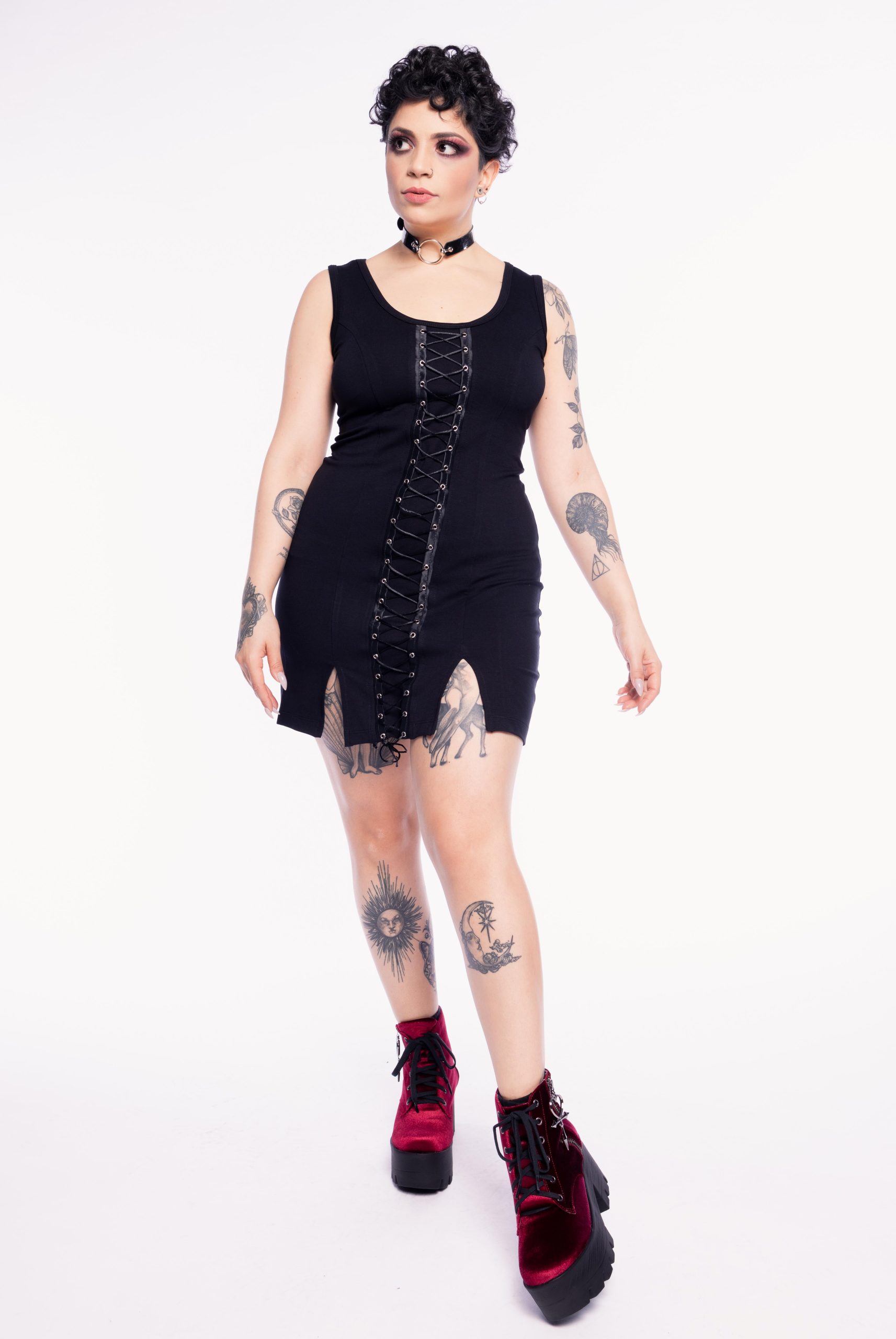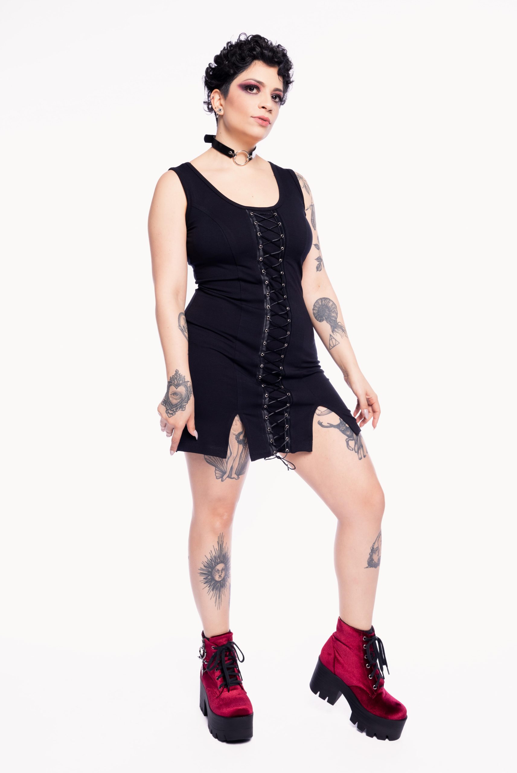 Vestido em moletinho com toque macio e encorpado, detalhe de amarração na frente para valorizar a silhueta e fendas na barra para dar mais movimento. Aquele vestido perfeito, justinho e dark pra você arrasar em qualquer lugar!