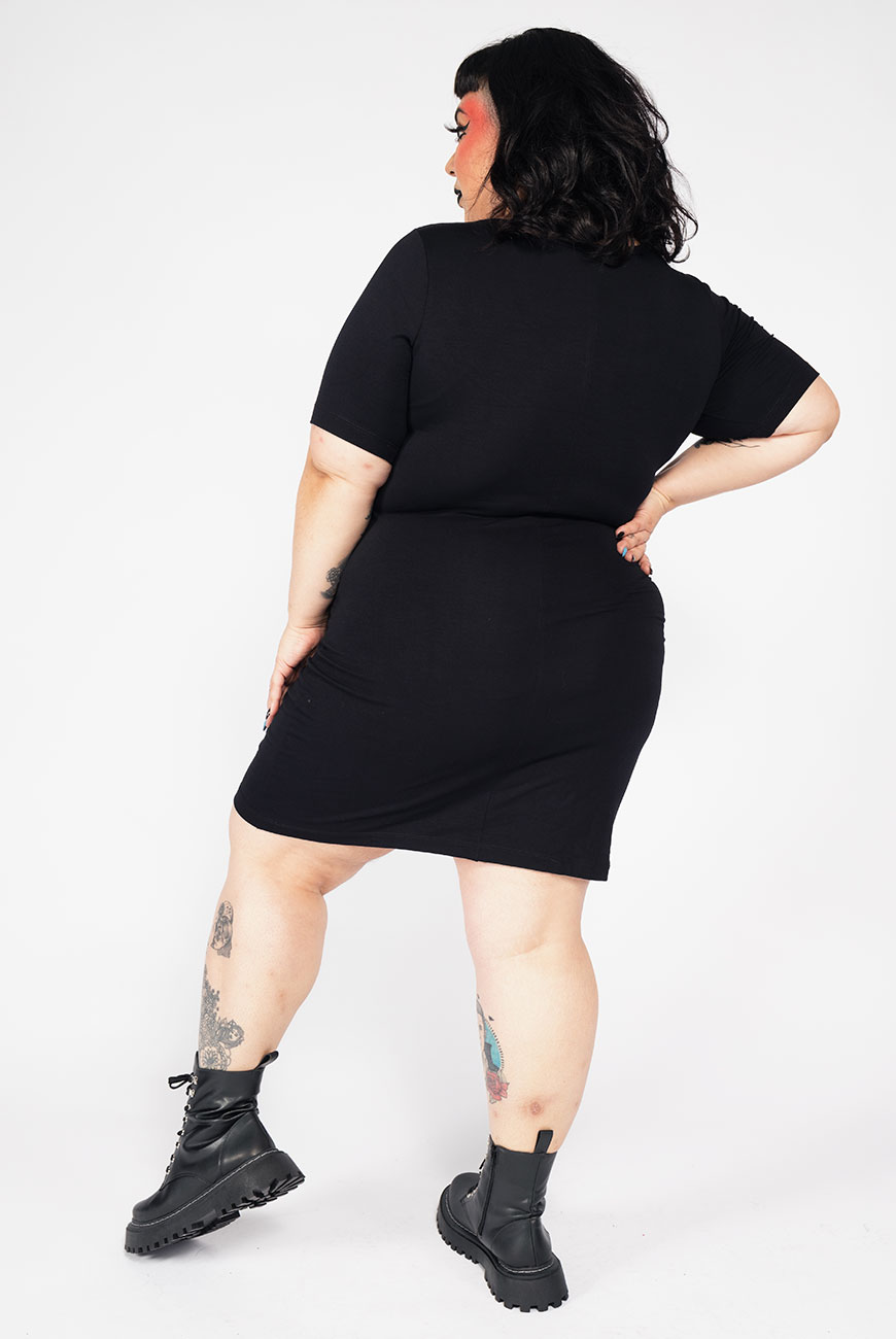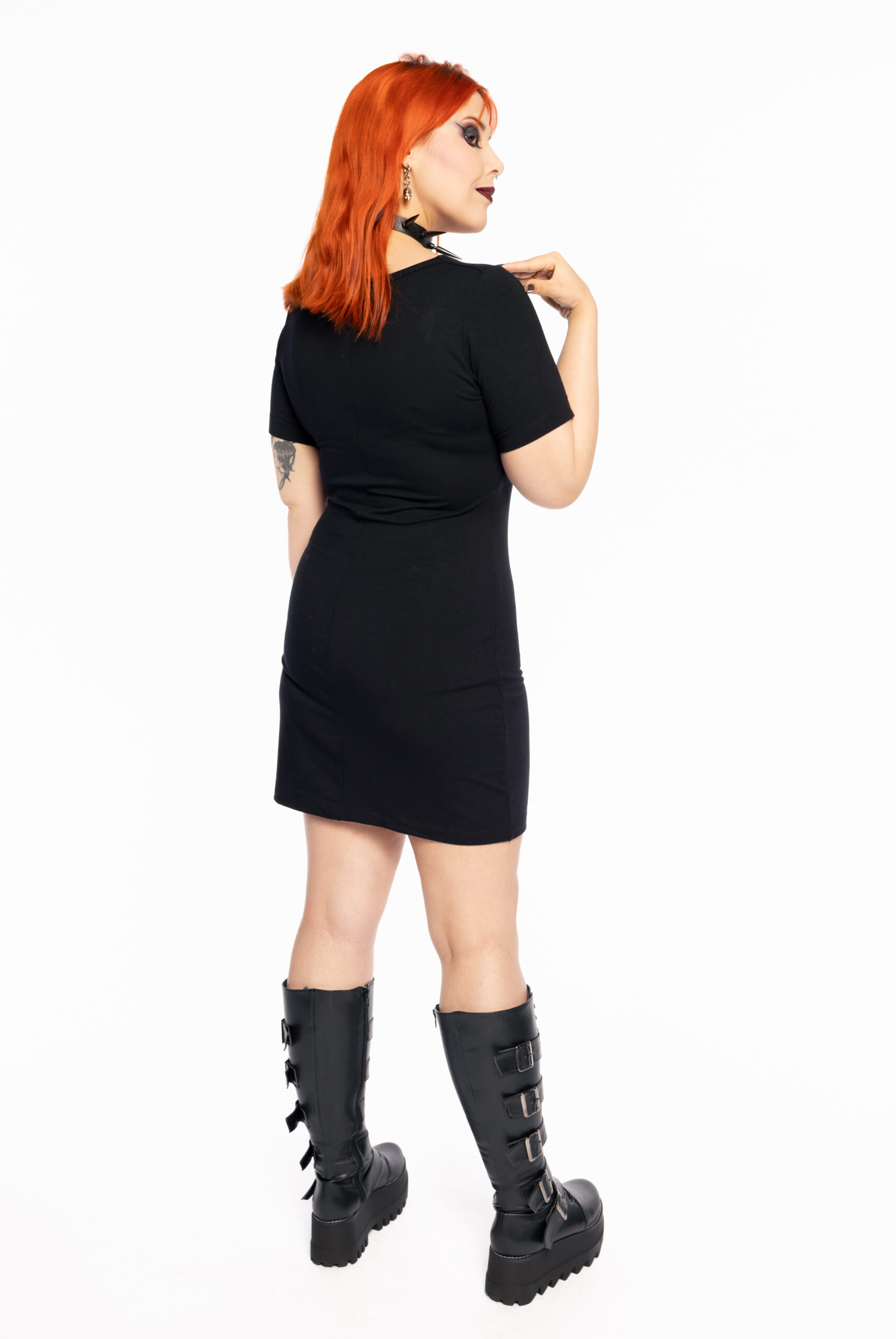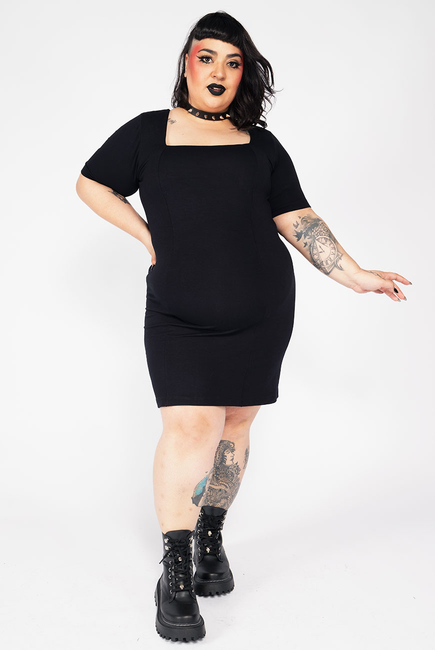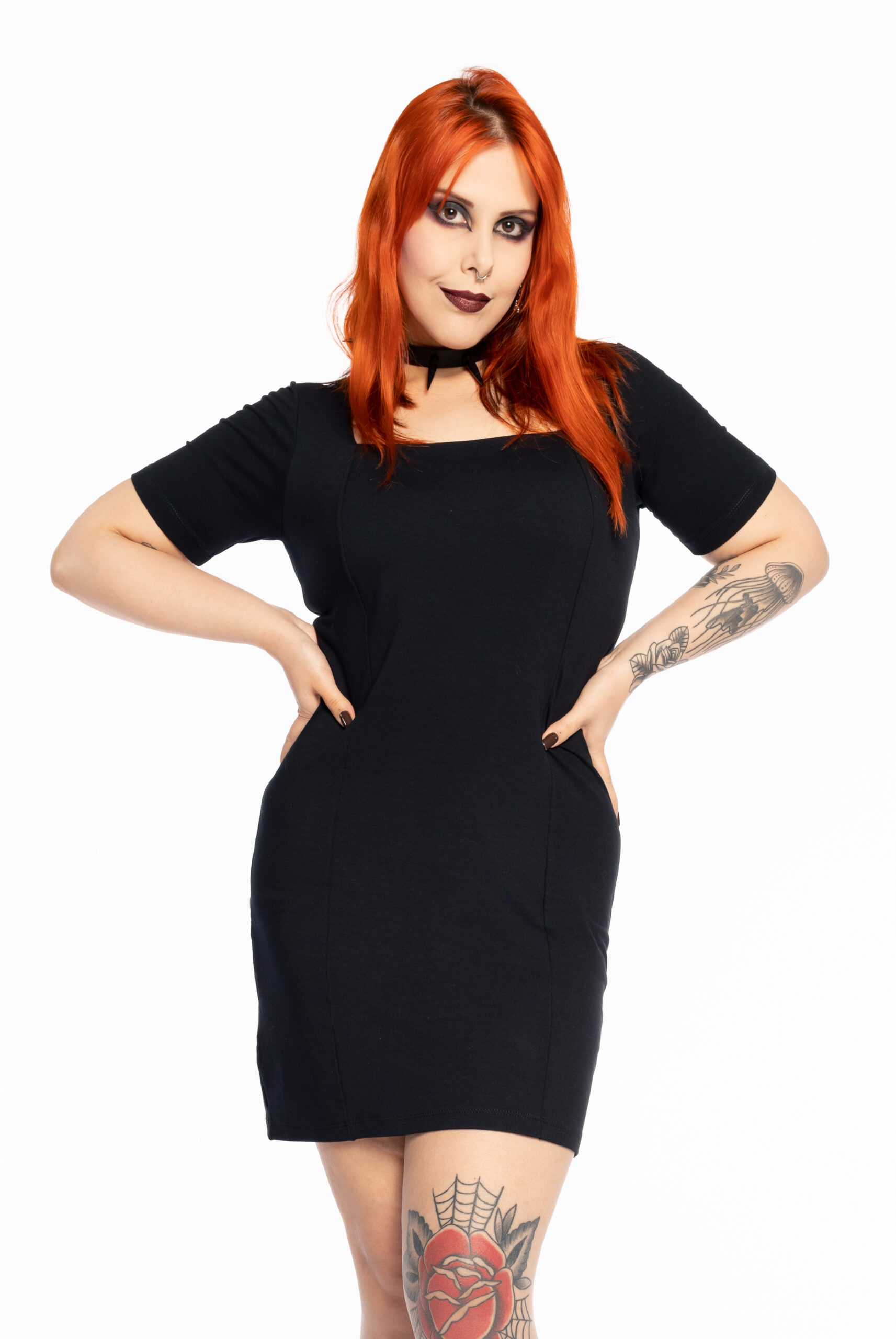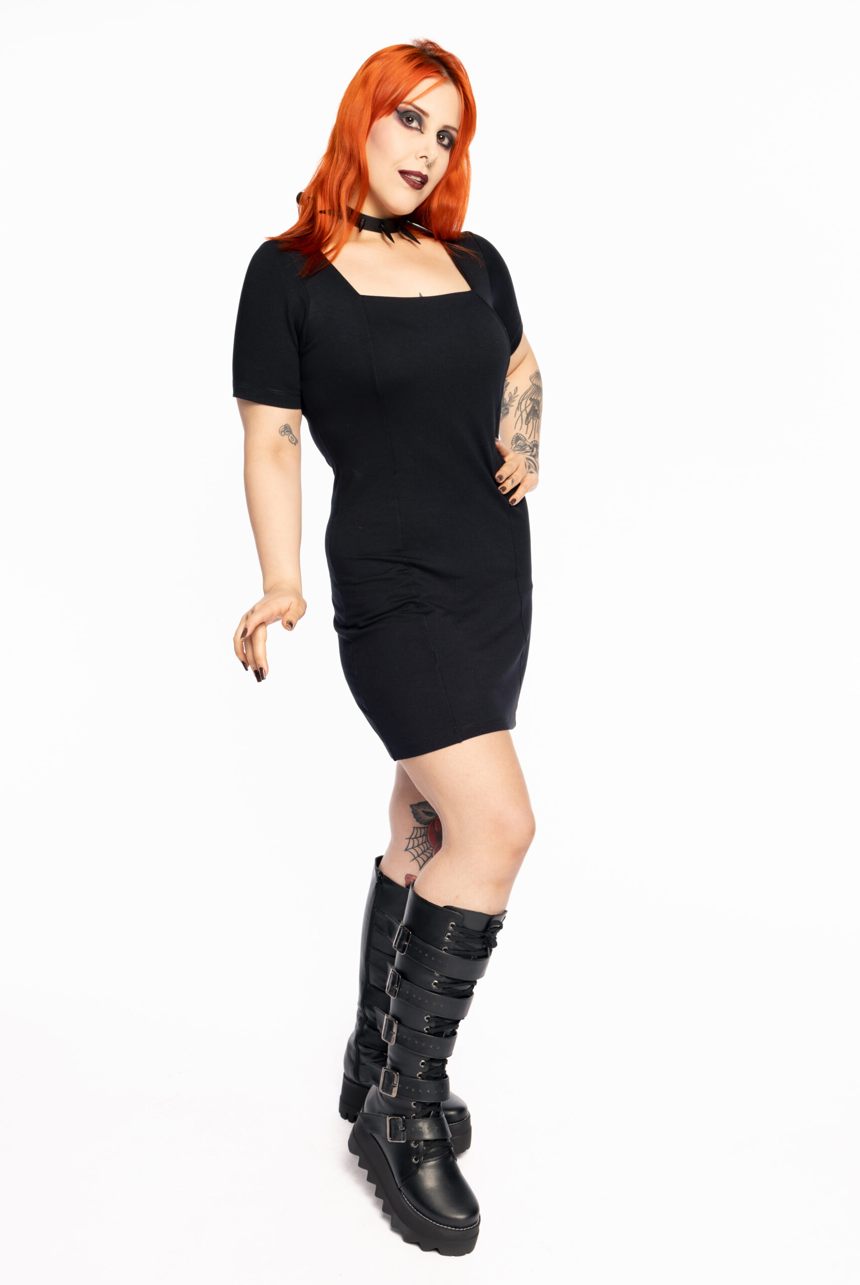 O vestido ideal para a gótica classuda! Feito em moletinho super macio e confortável, com recortes na linha do busto que valorizam o decote quadrado e deixam a peça mais bem ajustada ao corpo.