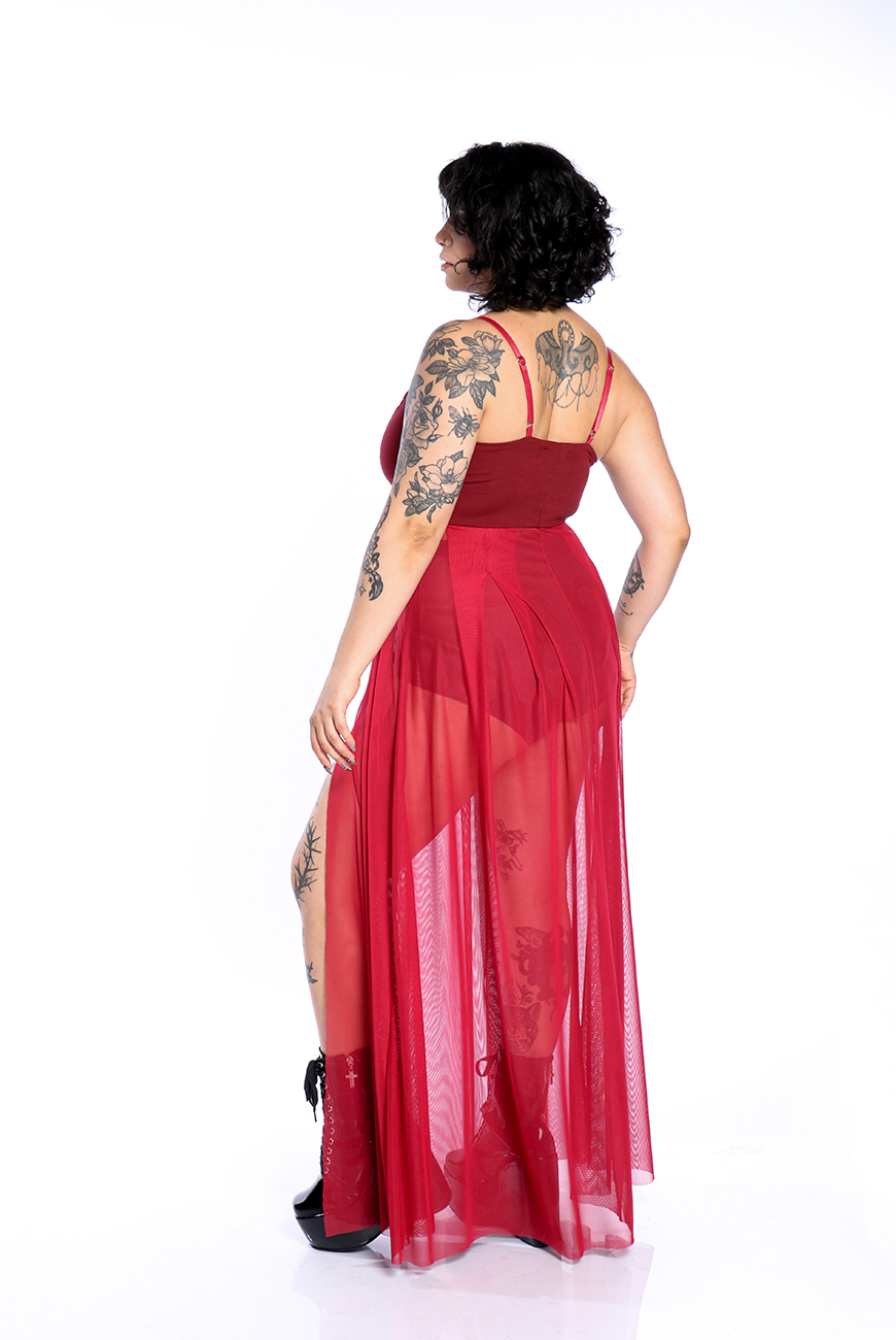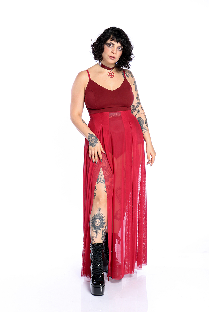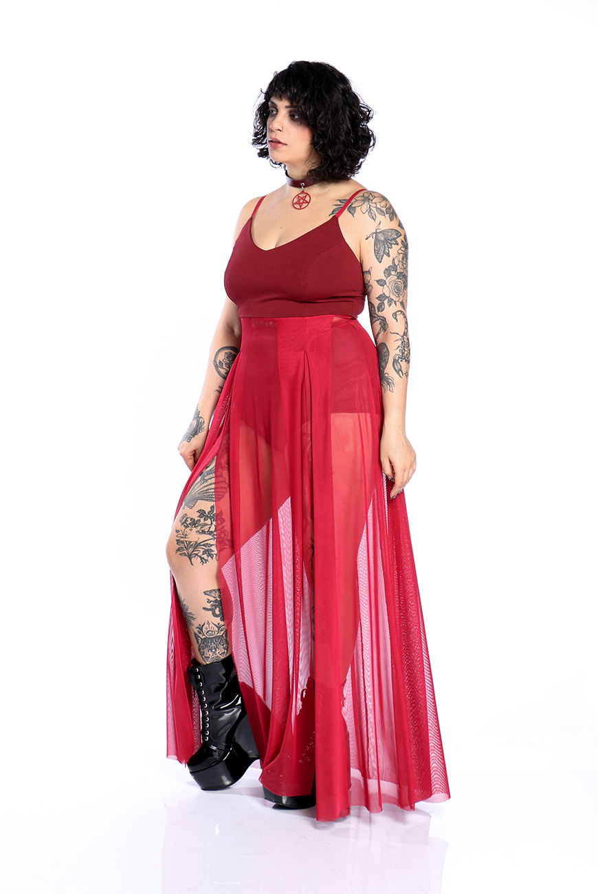 No busto, com um moletinho bordô muito confortável e forro de liganete, com recortes que acinturam e valorizam o busto, o deixando bem ajustado ao corpo. A saia é produzida em um tule bordô bem leve e esvoaçante, trazendo bastante fluidez e elegância para a peça.