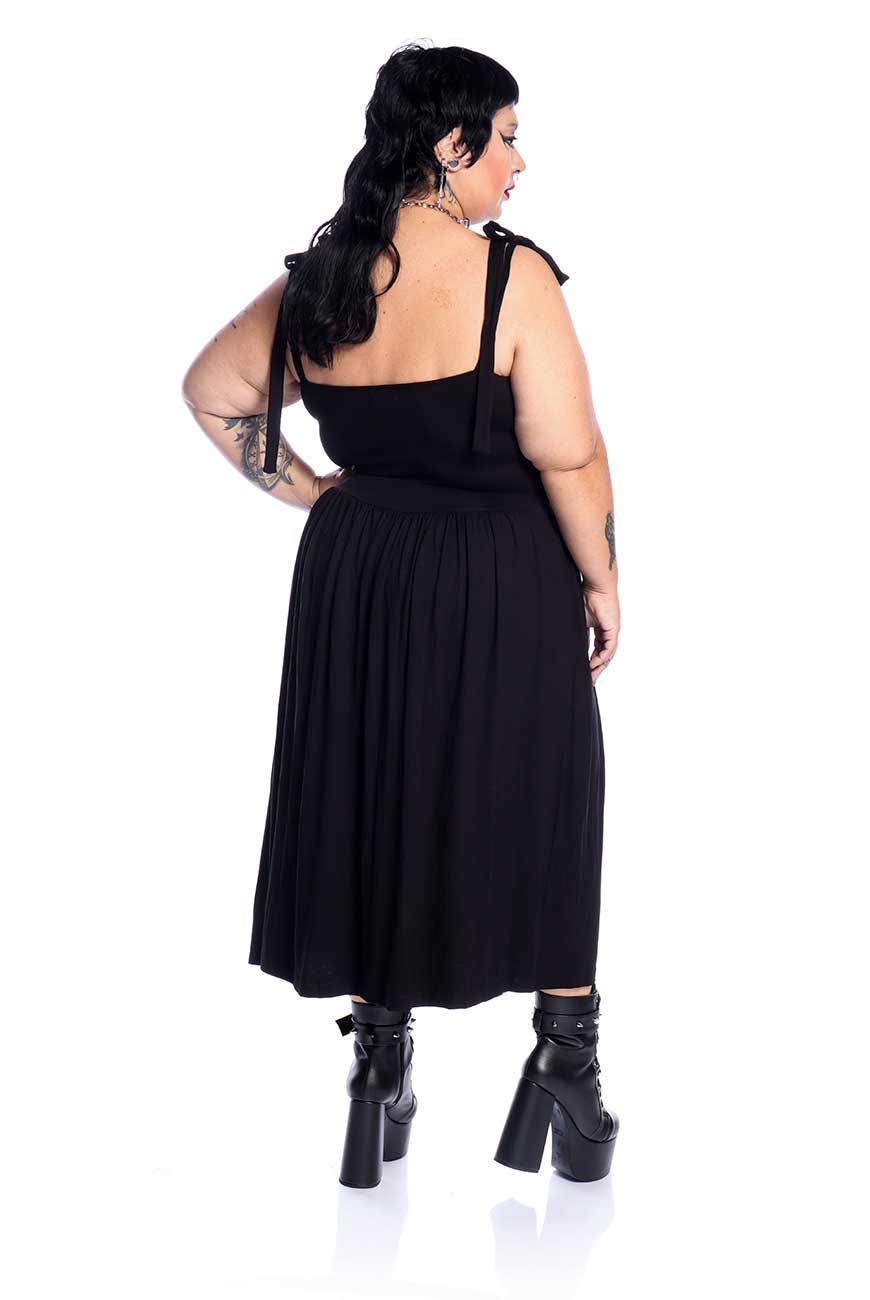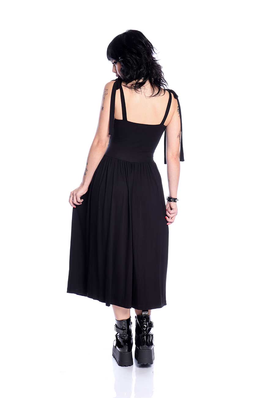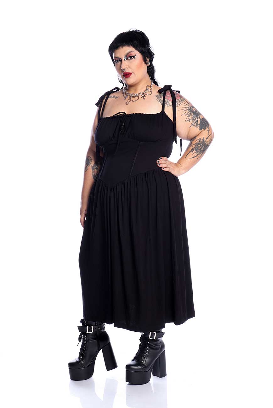 O Vestido Midi Corpete Nautilus possui uma modelagem e caimento incrível, com decote reto romântico, regulável por fita, e tiras com amarração nos ombros para você escolher o tamanho das alças.