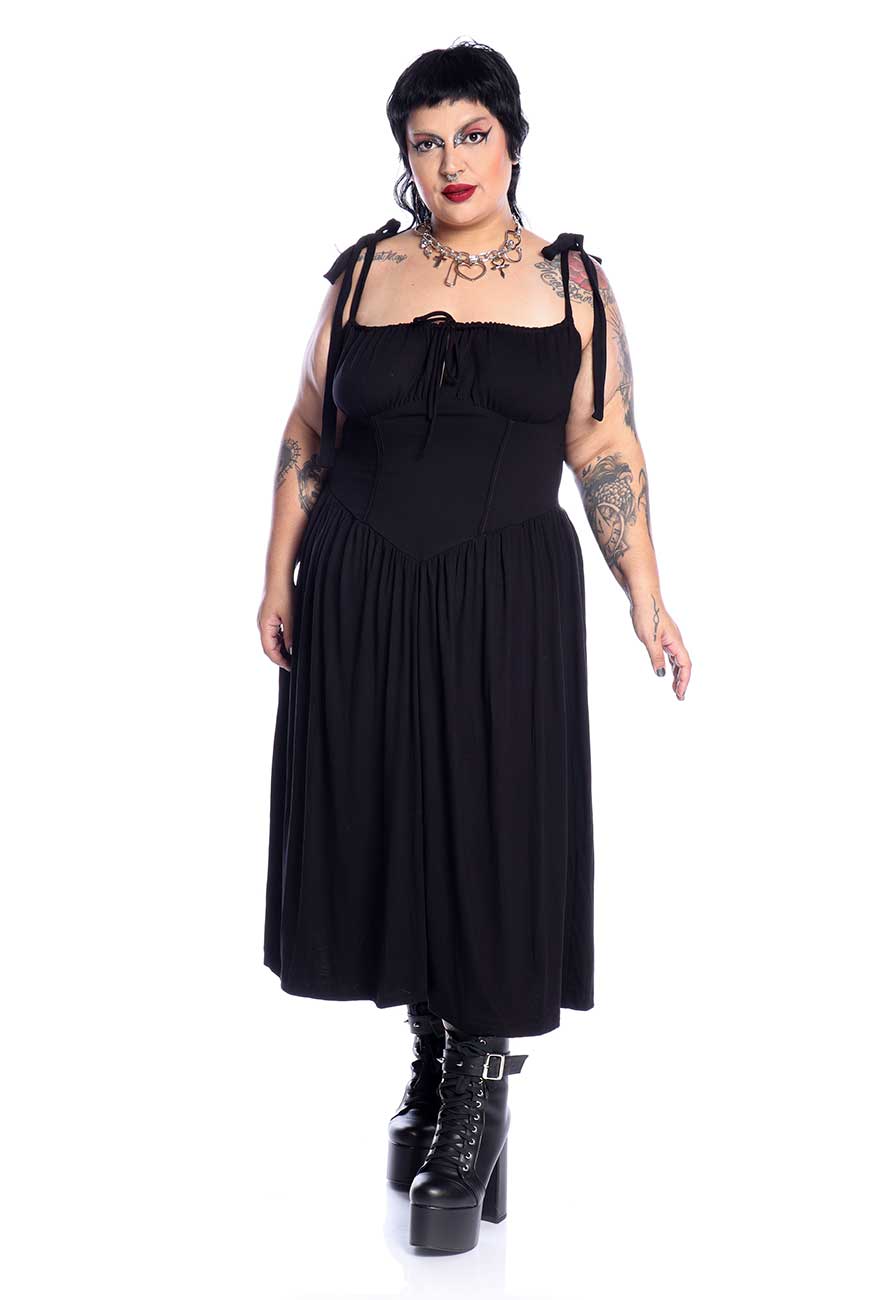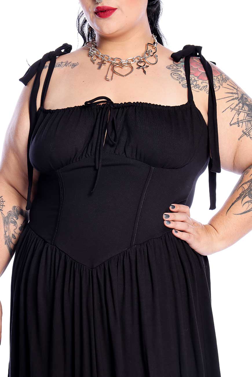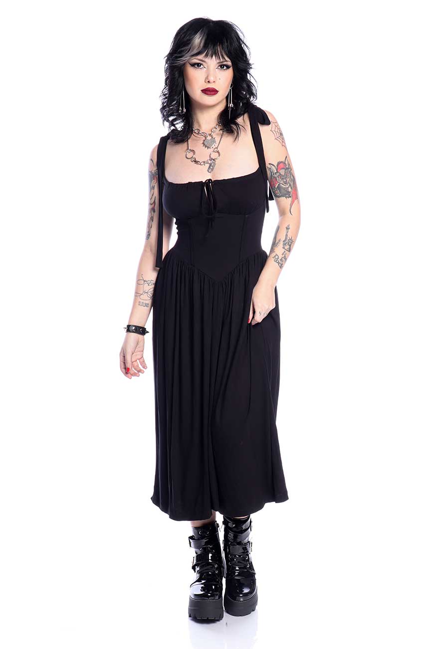 O Vestido Midi Corpete Nautilus possui uma modelagem e caimento incrível, com decote reto romântico, regulável por fita, e tiras com amarração nos ombros para você escolher o tamanho das alças.