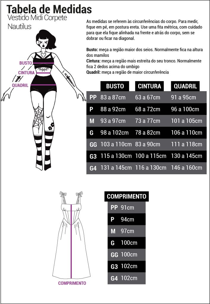 Modelo tamanho PP: Altura: 1,60m/ Cintura: 66cm/ Busto: 84cm/ Quadril: 94cm.