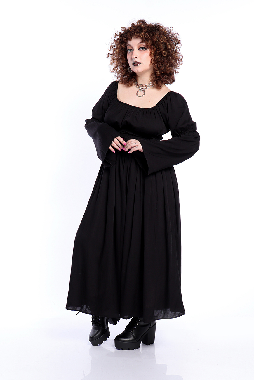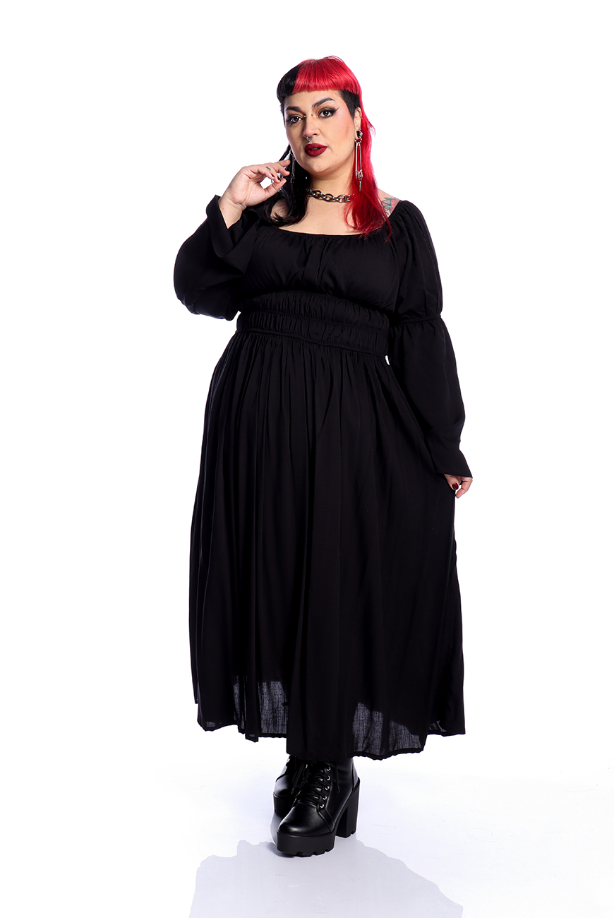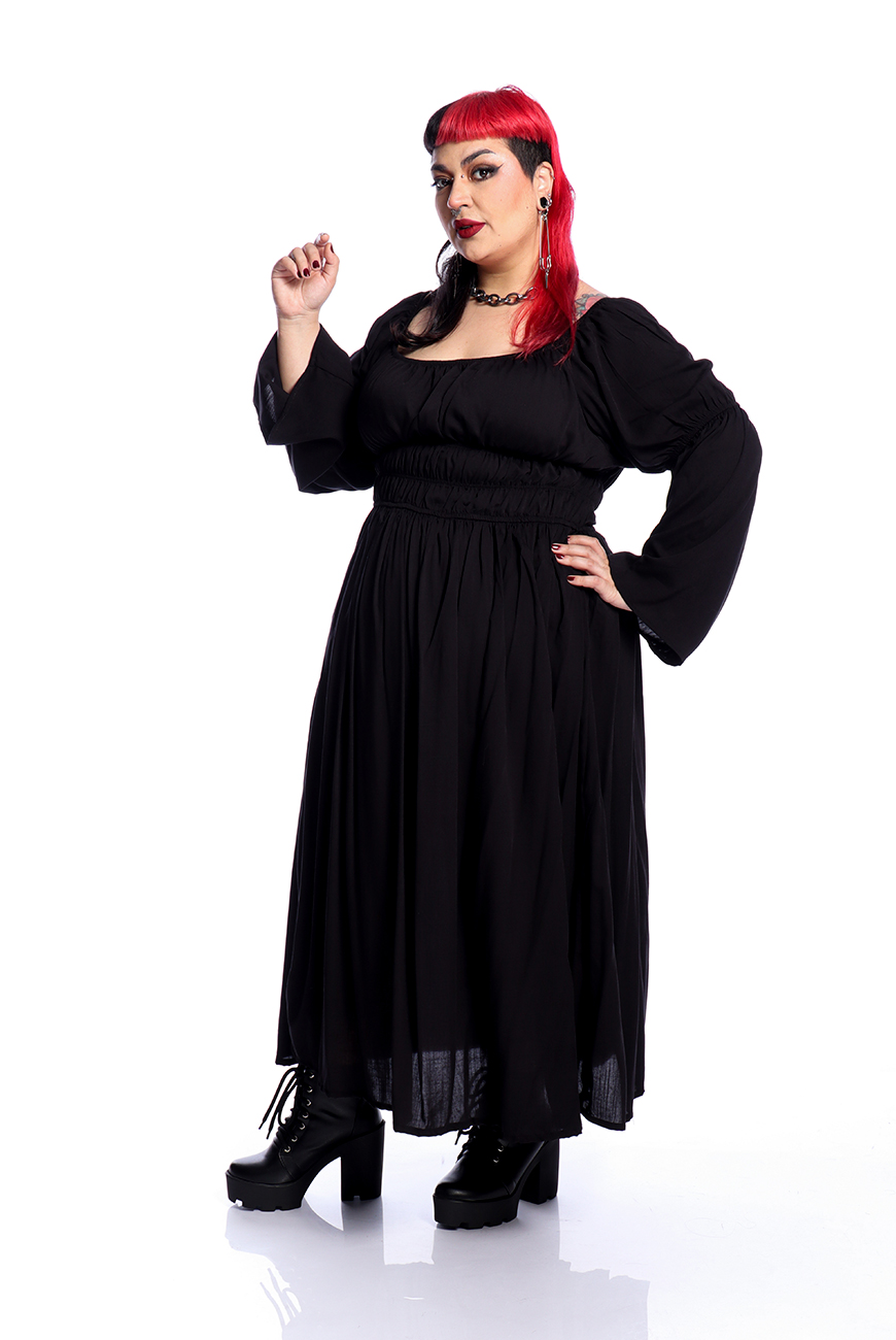 O Vestido Midi Preto Moria é produzido em viscose de alta qualidade, tendo inspiração medieval. Possui decote quadrado, três palas de elástico na cintura para trazer aquela silhueta bem acentuada e mangas longas com elásticos nos cotovelos. A saia é bem ampla e longa, trazendo conforto e um movimento incrível para a peça.
