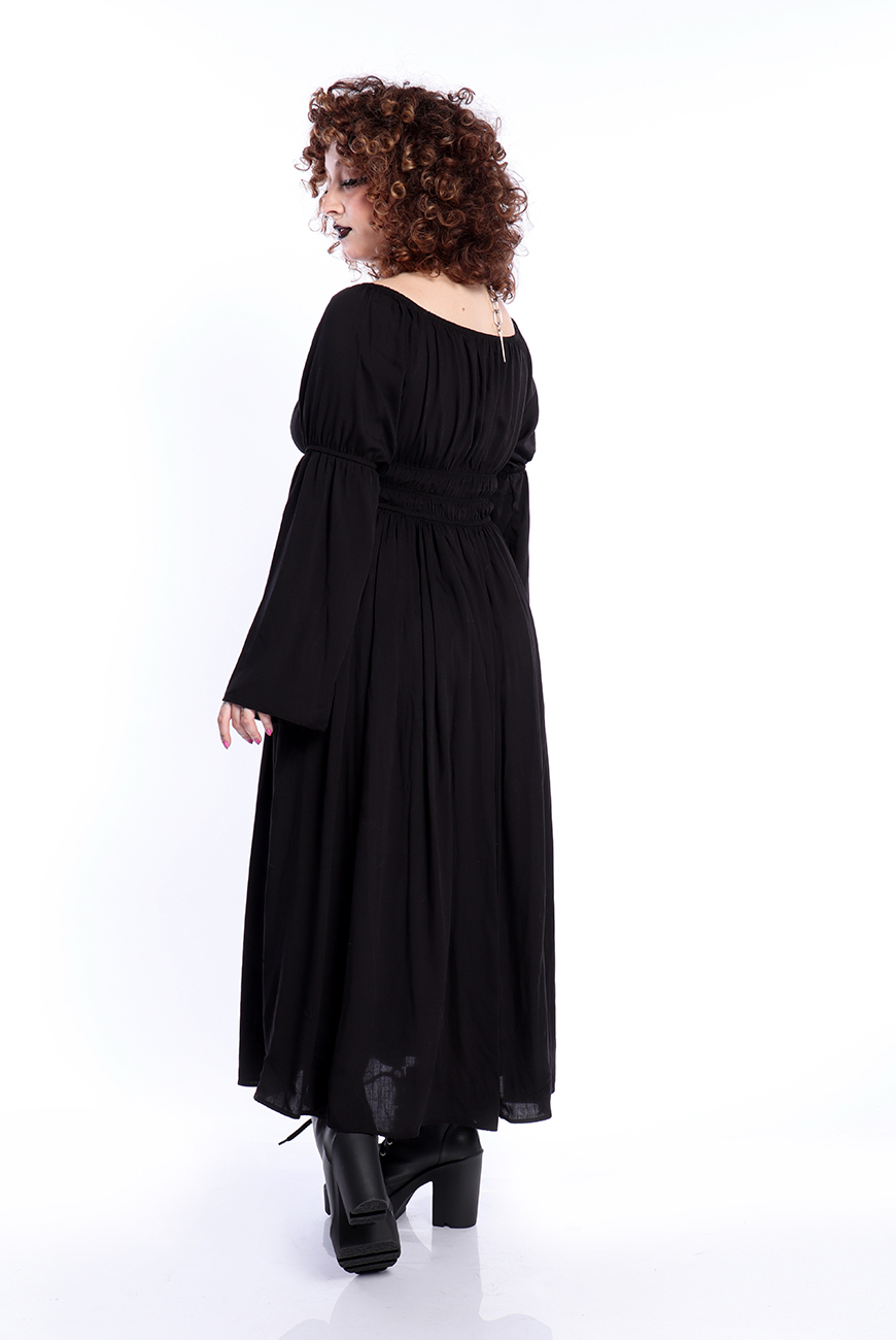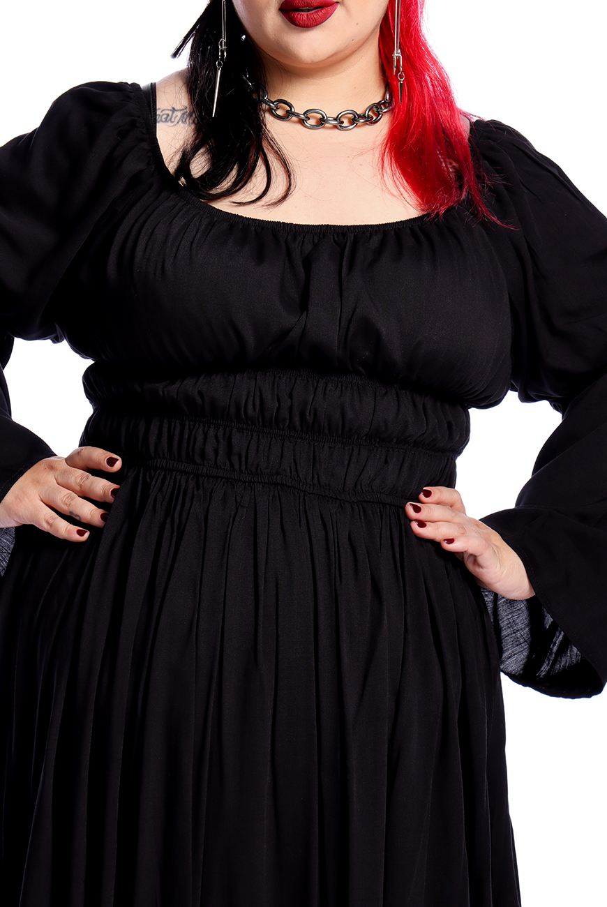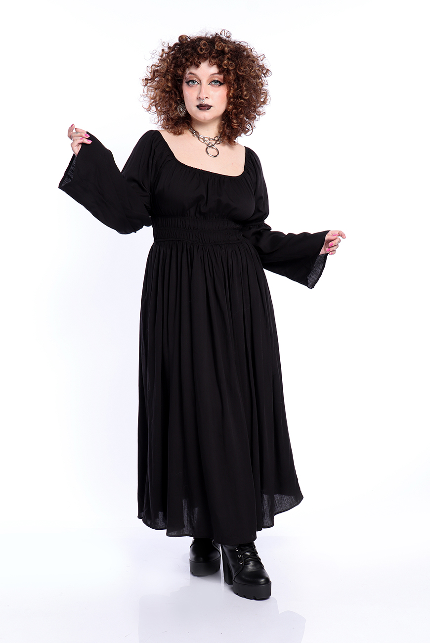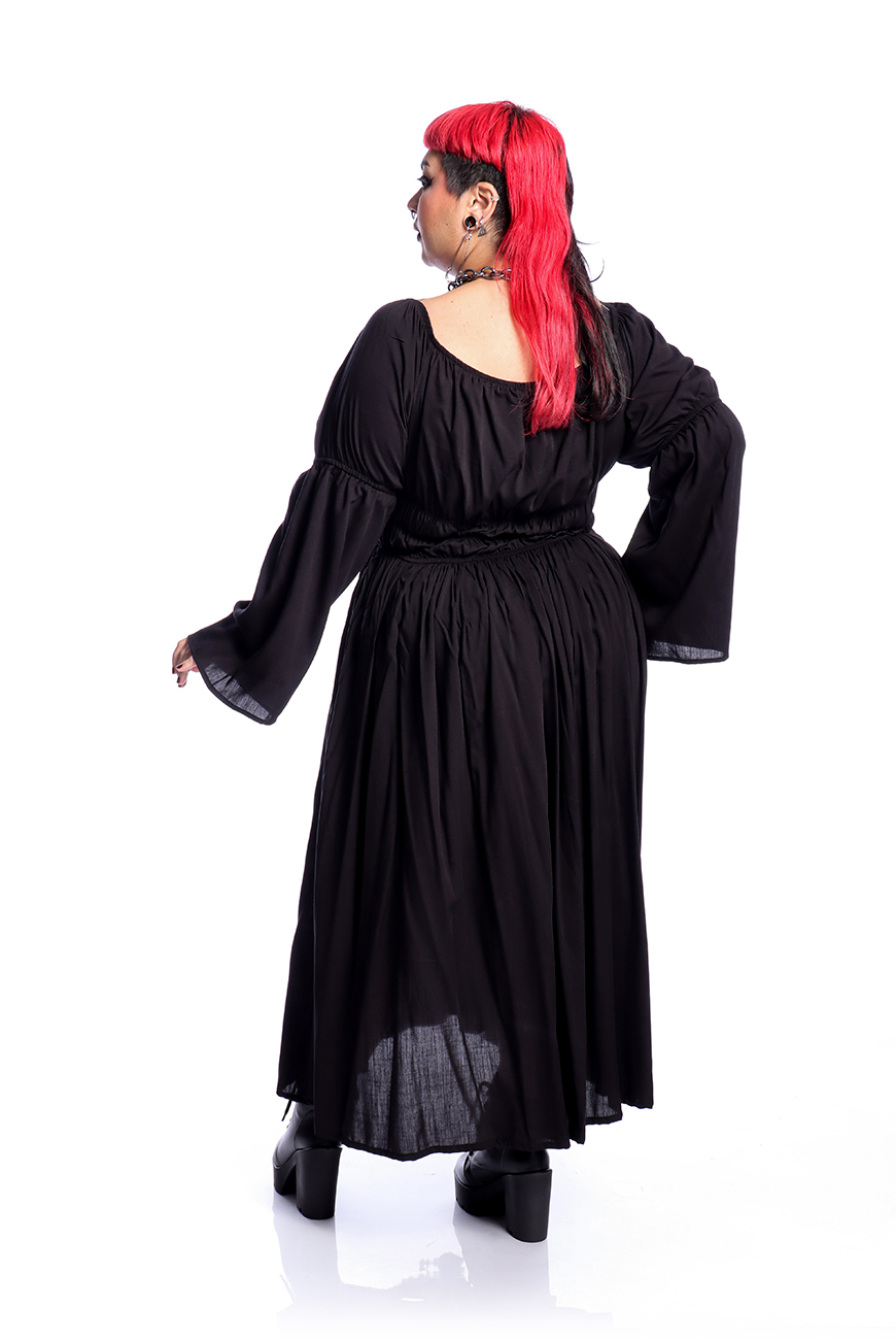 O Vestido Midi Preto Moria é produzido em viscose de alta qualidade, tendo inspiração medieval. Possui decote quadrado, três palas de elástico na cintura para trazer aquela silhueta bem acentuada e mangas longas com elásticos nos cotovelos. A saia é bem ampla e longa, trazendo conforto e um movimento incrível para a peça.