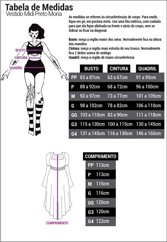 Modelo tamanho G3: Altura: 1,60m/ Cintura: 96cm/ Busto:116cm/ Quadril: 131cm.