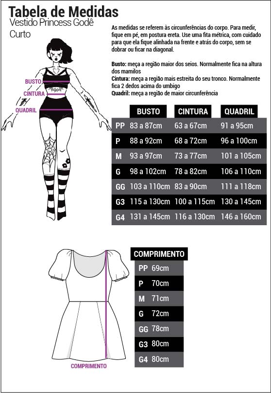 Modelo tamanho PP: Altura: 1,60m/ Cintura: 66cm/ Busto: 84cm/ Quadril: 94cm.