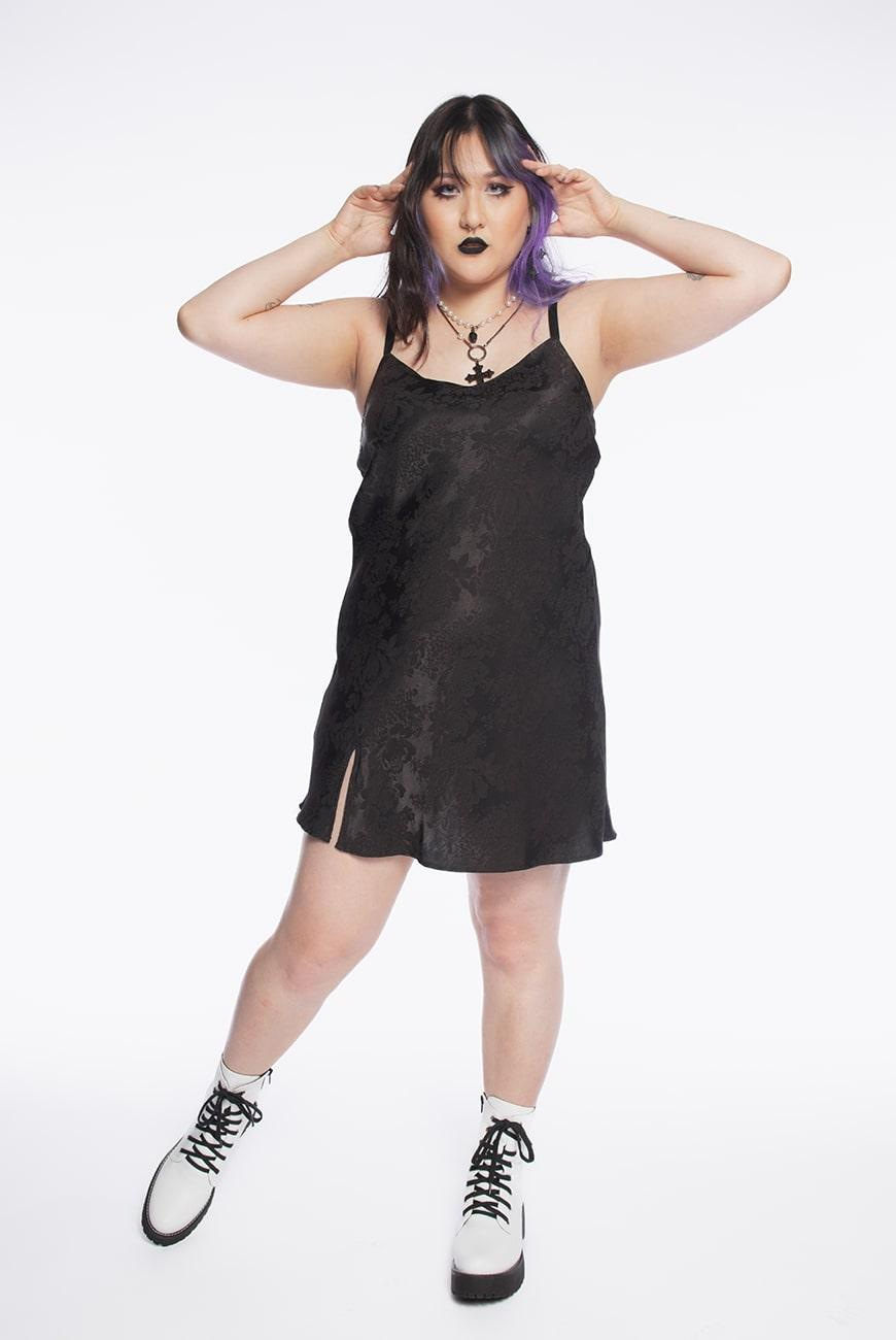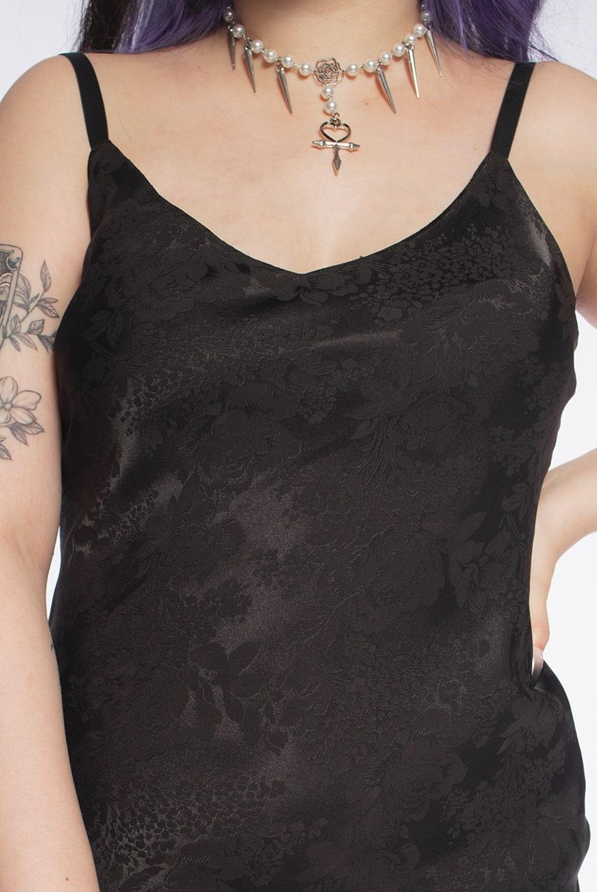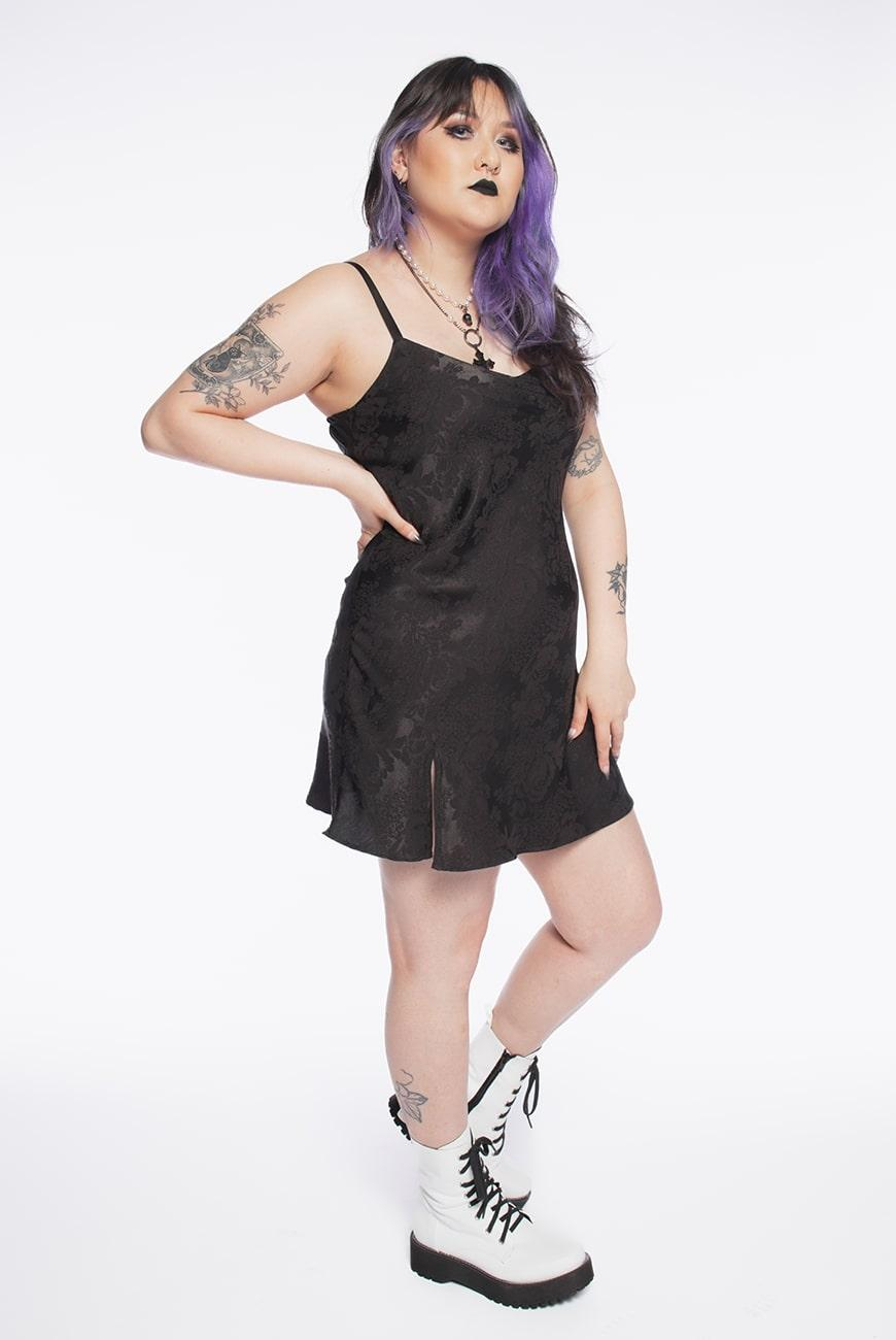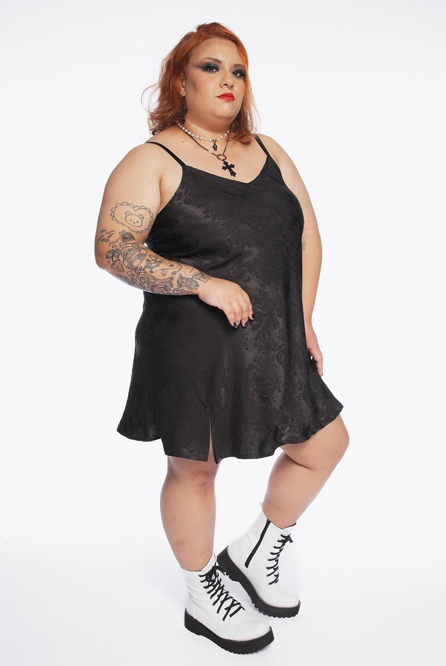O Vestido Slip Arabesque Preto é produzido em tecido super leve com brocado de brilho acetinado, trazendo elegância para a modelagem soltinha e confortável do vestido. Possui alças com reguladores de tamanho e fenda na lateral direita para trazer mais leveza e charme para a peça.