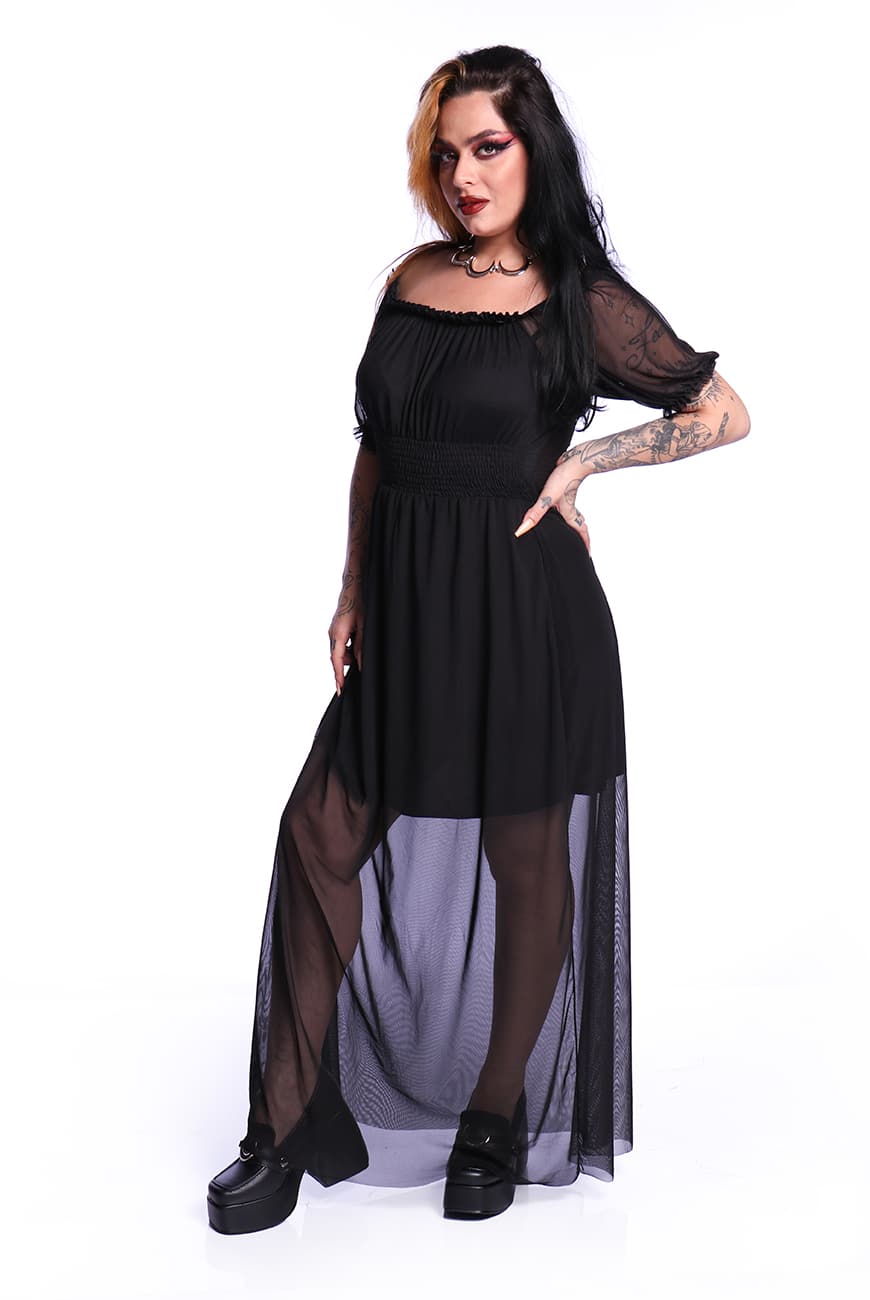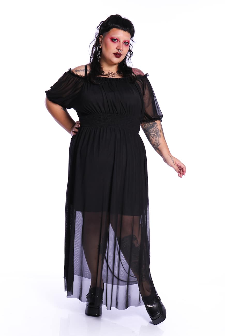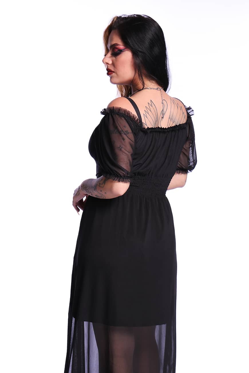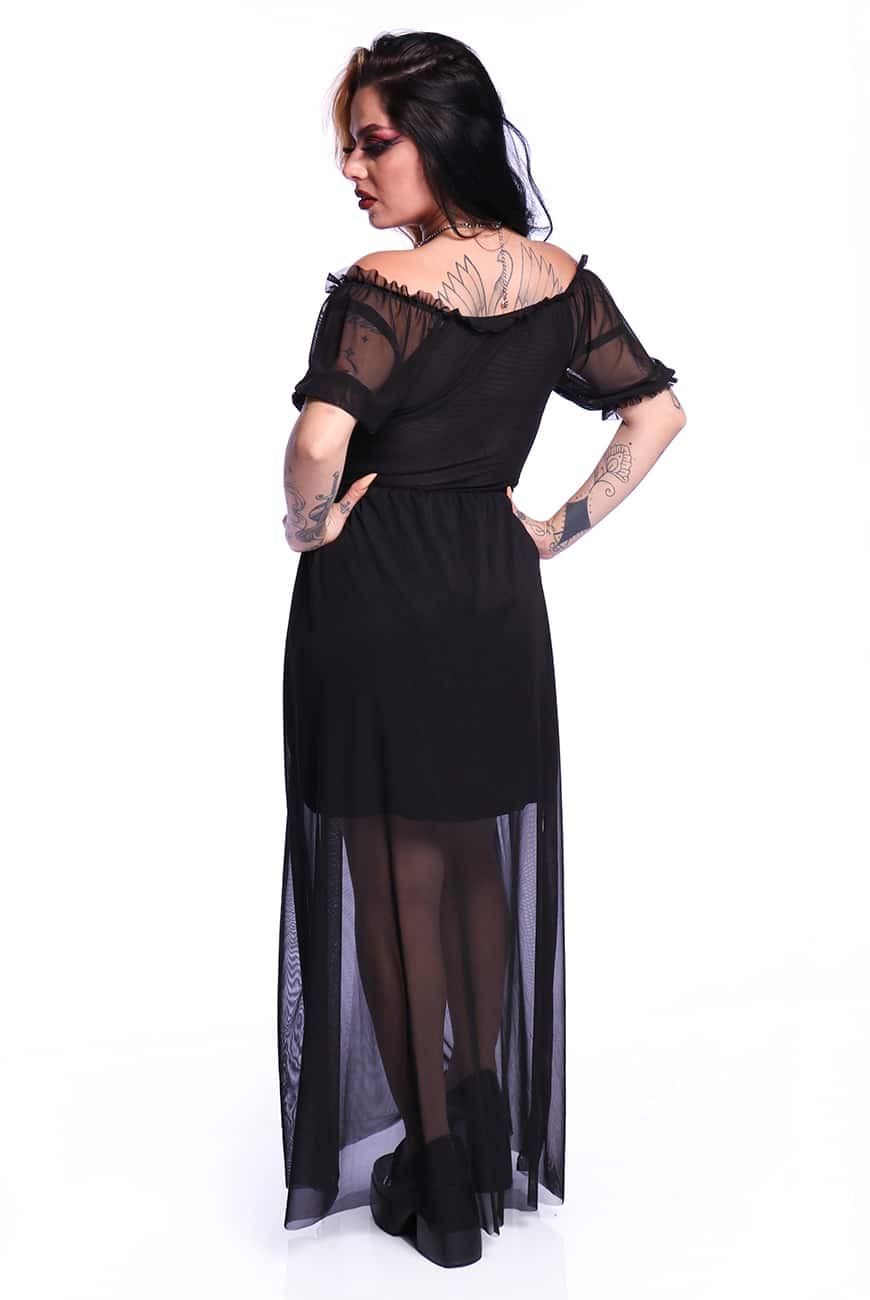 Produzido em um tule macio e leve, possui comprimento longo e decote que pode ser usado quadrado ou ombro a ombro. Outro detalhe incrível do decote é que ele tem forro duplo na frente e apenas uma camada de tule nas costas, possibilitando o uso dos dois lados (dependendo do seu mood de criatura noturna).