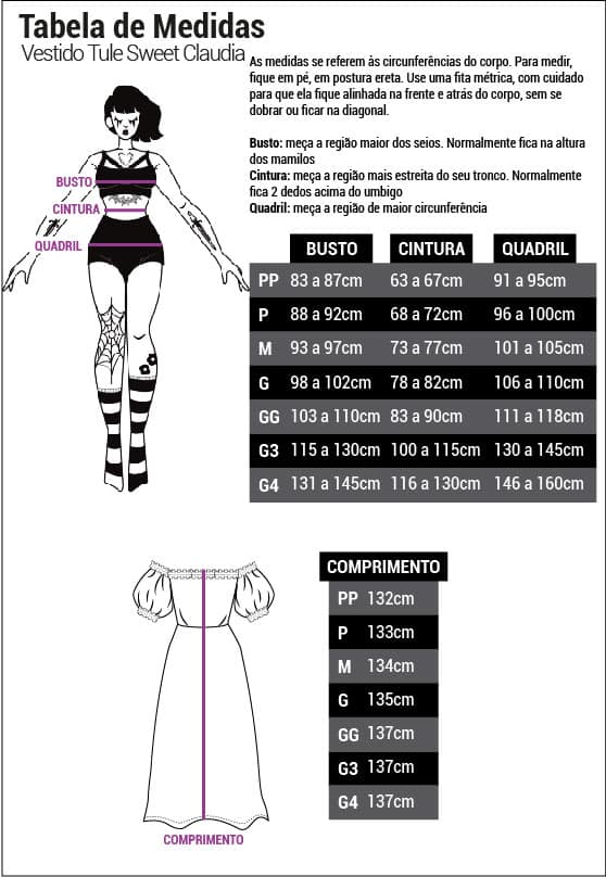 Modelo tamanho G3: Altura: 1,60m/ Cintura: 98cm/ Busto: 121cm/ Quadril: 133cm.