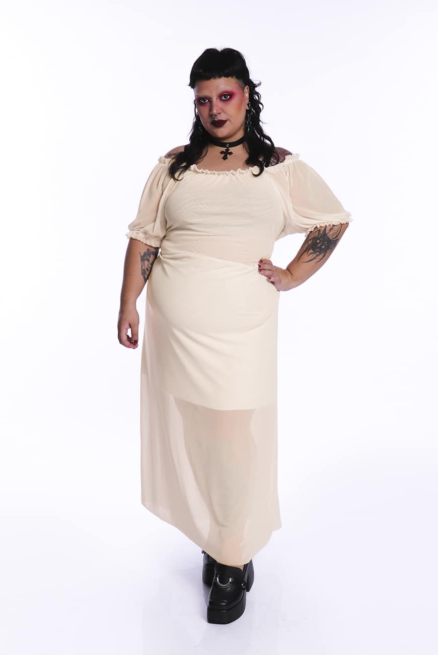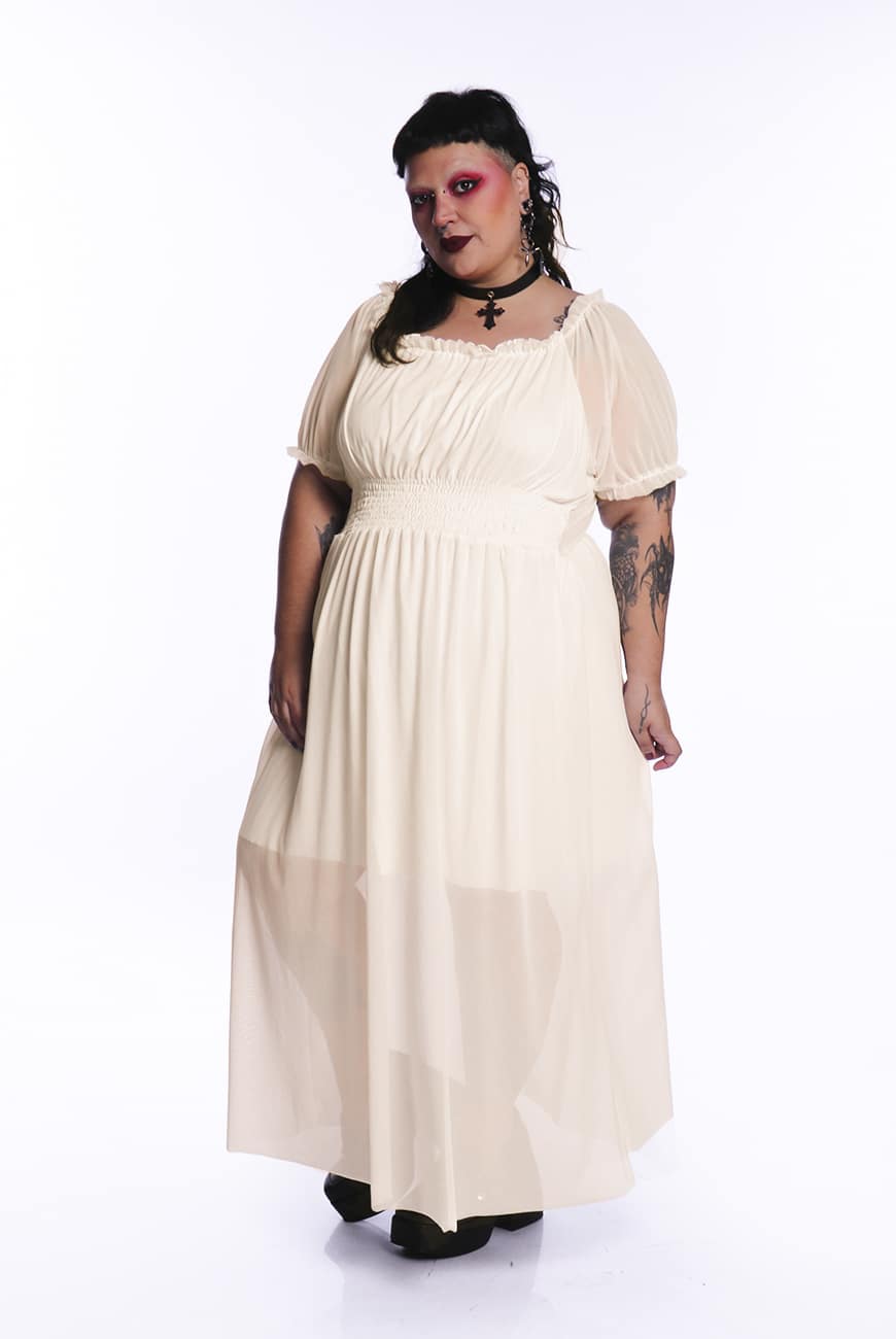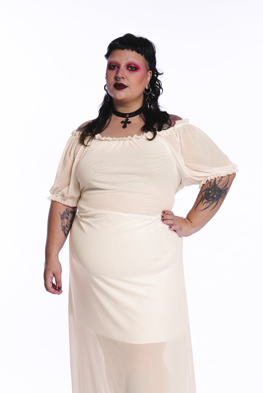 Dica: Para aquele look de morta-viva que amamos, use com o nosso Colar Correntes Duplo Lenore e Mocassim Meia Pata Moon Eternal; Para um look com inspiração kinderwhore, estilize com o nosso Harness de Corpo Stolas, Gargantilha Choker Amarração Kindred e Bota Coturno Tratorada Max Doom.