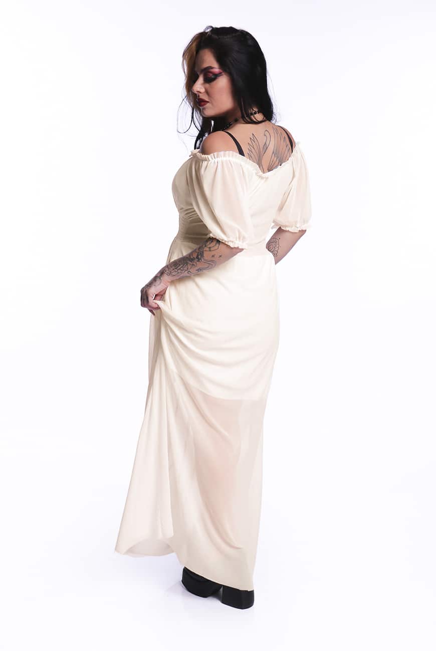 A peça possui comprimento longo e decote que pode ser usado quadrado ou ombro a ombro. Outro detalhe incrível do decote é que ele tem forro duplo na frente e apenas uma camada de tule nas costas, possibilitando o uso dos dois lados (dependendo do seu mood de criatura noturna).