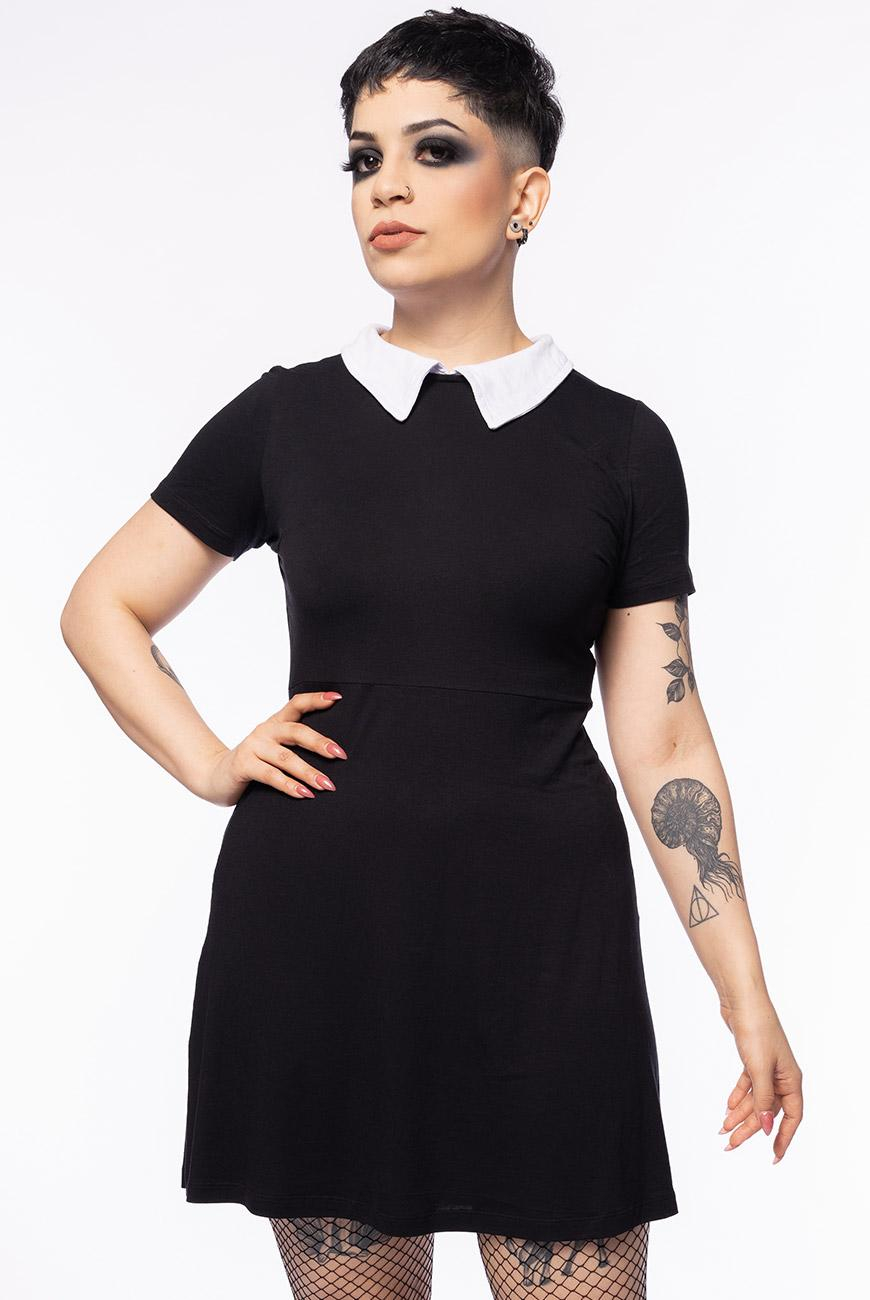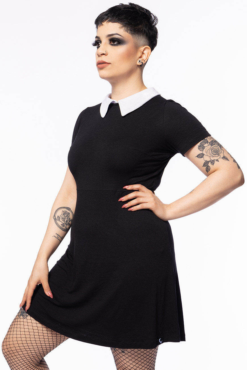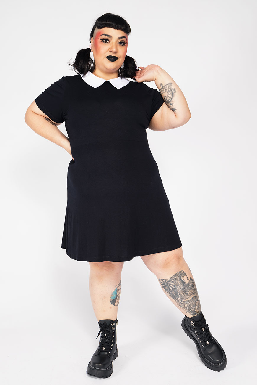 Nosso clássico vestido inspirado na Vandinha, agora em versão godê com mangas curtas. Super confortável, em malha macia com gola alta em algodão, com fecho em spike. É o vestido perfeito para combinar com todo o seu guarda roupa.