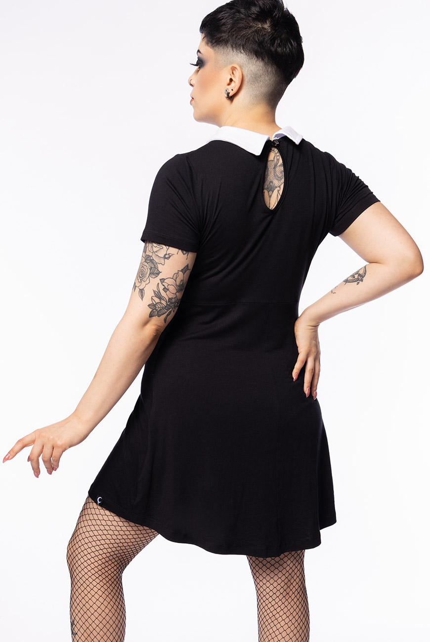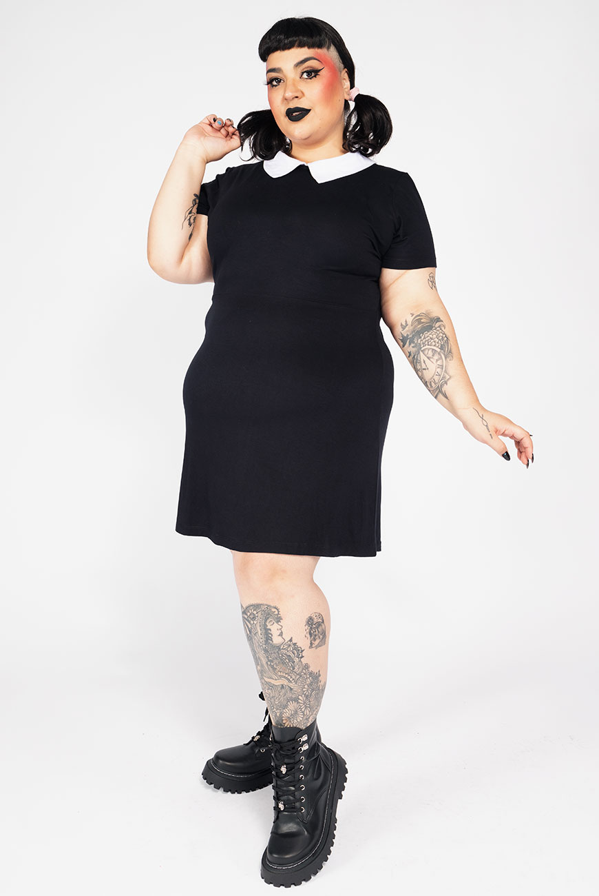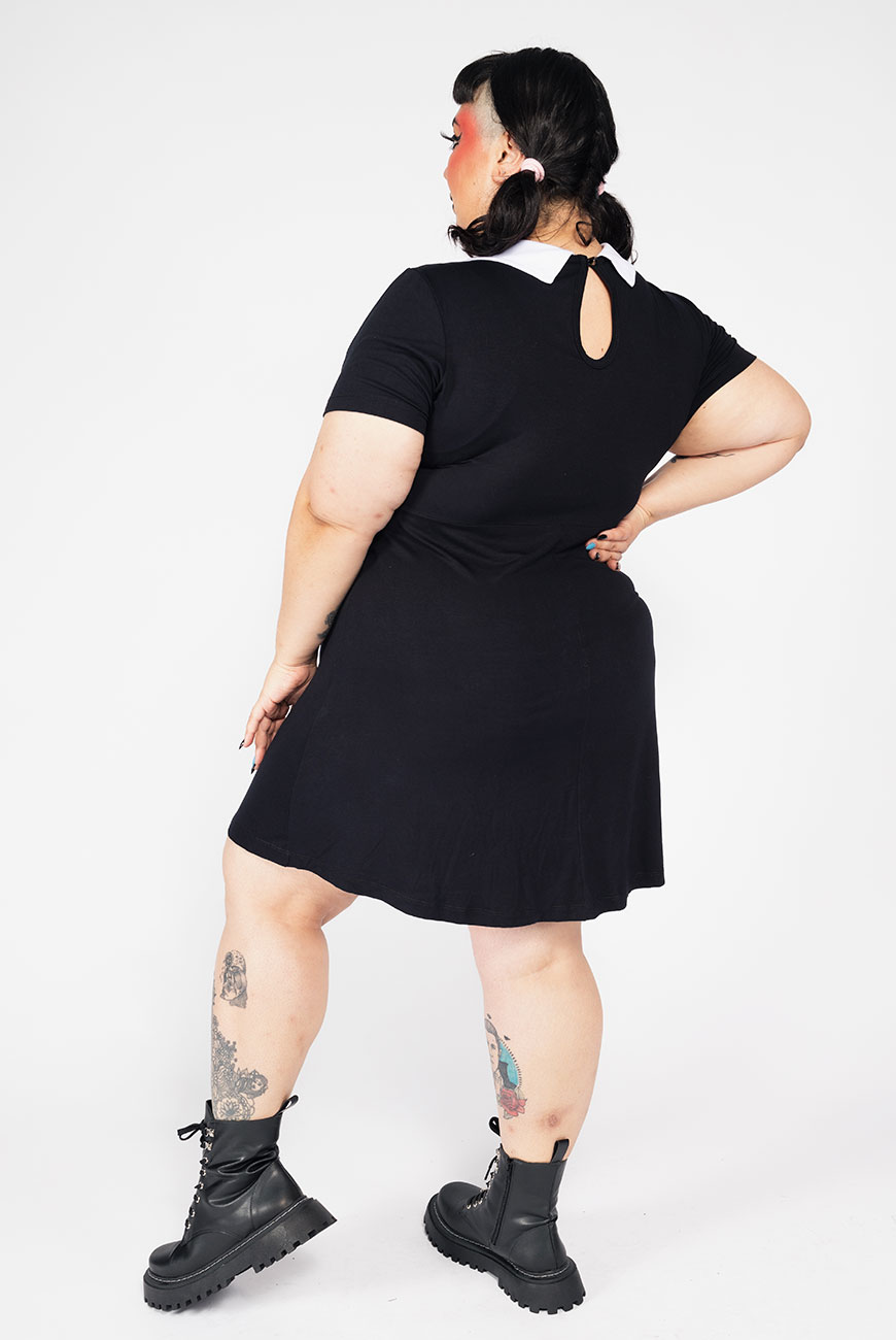 Nosso clássico vestido inspirado na Vandinha, agora em versão godê com mangas curtas. Super confortável, em malha macia com gola alta em algodão, com fecho em spike. É o vestido perfeito para combinar com todo o seu guarda roupa.